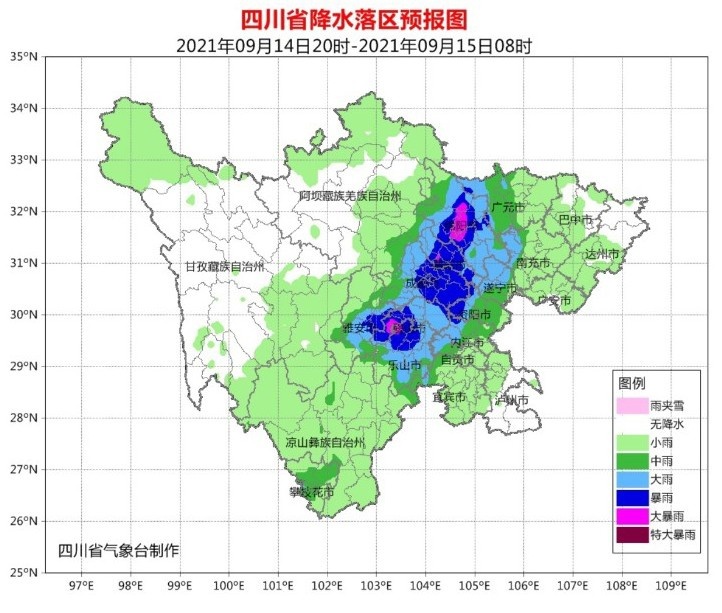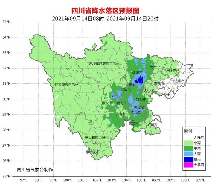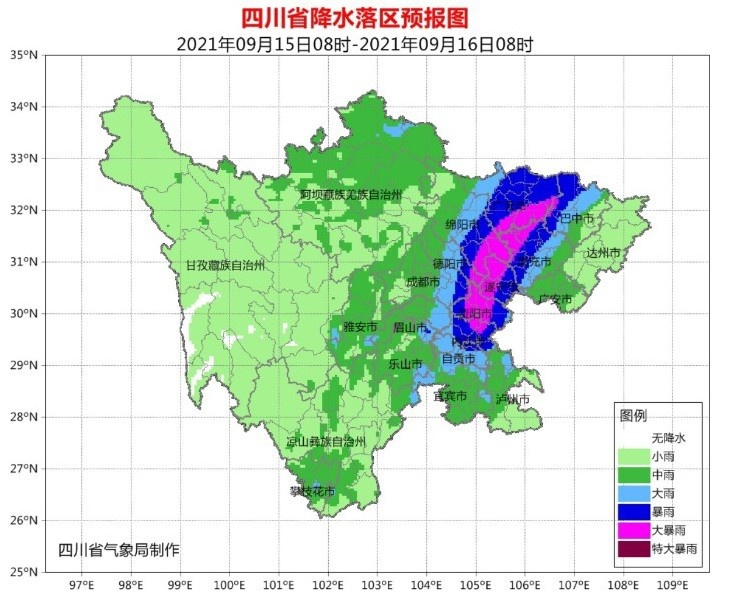 15日白天到晚上,盆地各市阴天有小到中雨,其中广元、遂宁、资阳、内江、自贡5市和绵阳、德阳、成都3市东部以及巴中、南充2市西部有大到暴雨,局部大暴雨;川西高原和攀西地区阴天间多云有阵雨或雷雨,其中阿坝州北部和攀西地区南部的部分地方有中雨,局部大雨。