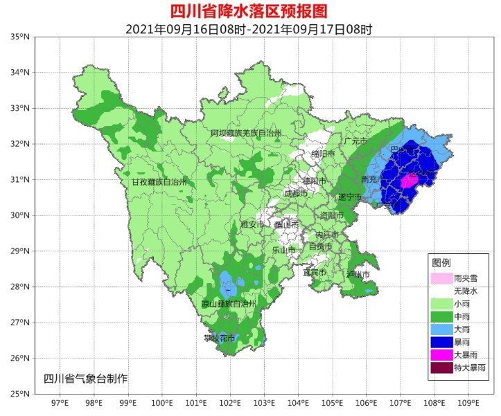 16日白天到晚上,巴中、达州、南充、广安4市阴天有大到暴雨,局部大暴雨,盆地其余各市阴天间多云有分散阵雨或雷雨,其中遂宁、泸州2市以及广元东部有中雨;川西高原阴天间多云有阵雨或雷雨,其中甘孜州西北部和阿坝州南部有中雨;攀西地区阴天有小到中雨,局部大雨。