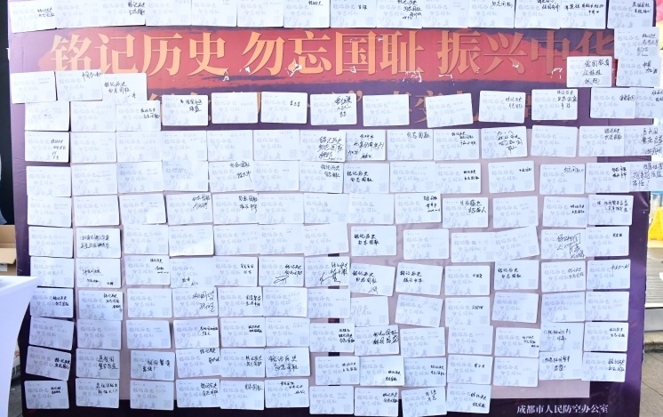 前事不忘,后事之师。人民防空教育融军事知识及民防知识于一体,思想性、综合性、实践性强,与现实生活联系紧密。9月13日11时,成都市人防办将“铭记历史·勿忘国耻”主题宣传活动开在了“奥克斯广场+德商国际”办公区,收到过往群众书写的以“铭记历史、勿忘国耻、振兴中华”主题卡553张。