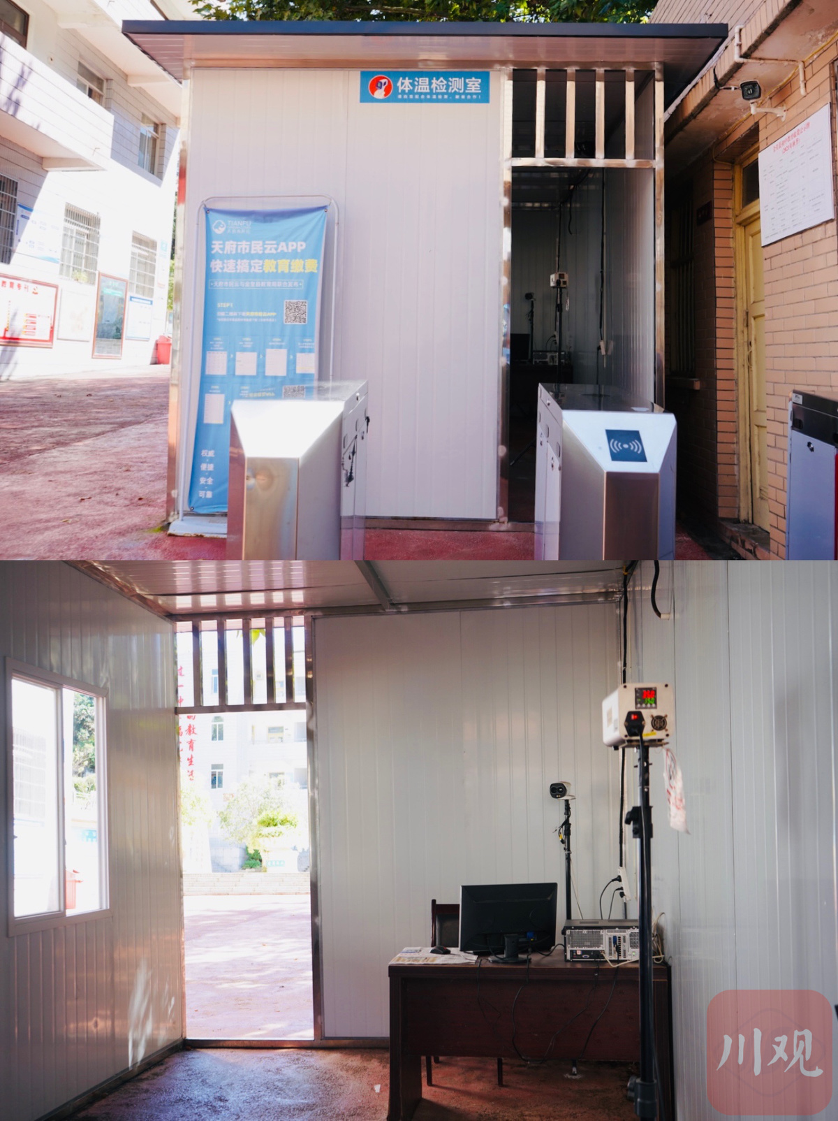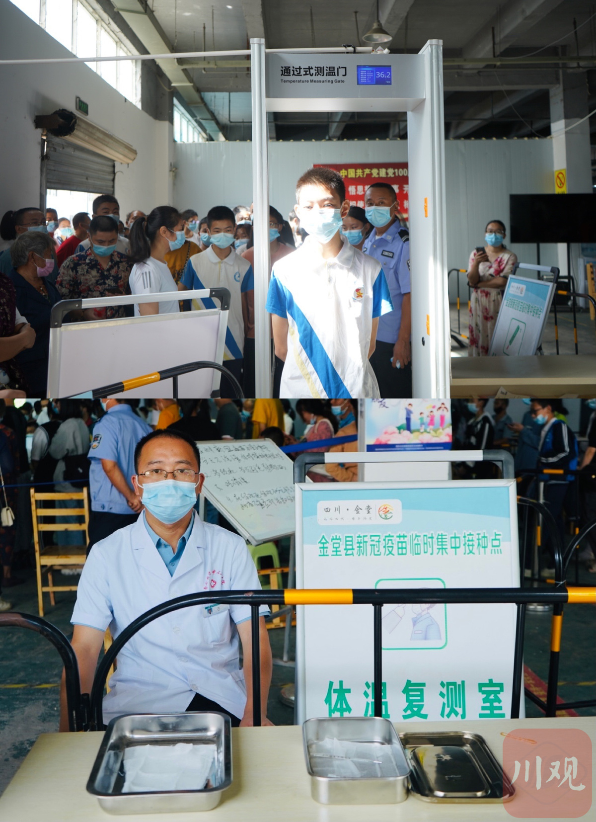 整个接种过程中,有三个细节令记者印象深刻。一个细节,是进入接种点内,有两个体温检测环节——一个是“通过式测温门”,另一个是紧挨着测温门的“体温复测室”。“使用这个测温门,可以通过机器自动检测孩子们是否有体温异常,当有体温异常,我们会在体温复测室进行再度测量。”接种点负责人、金堂县淮口社区卫生服务中心副院长周峰介绍。