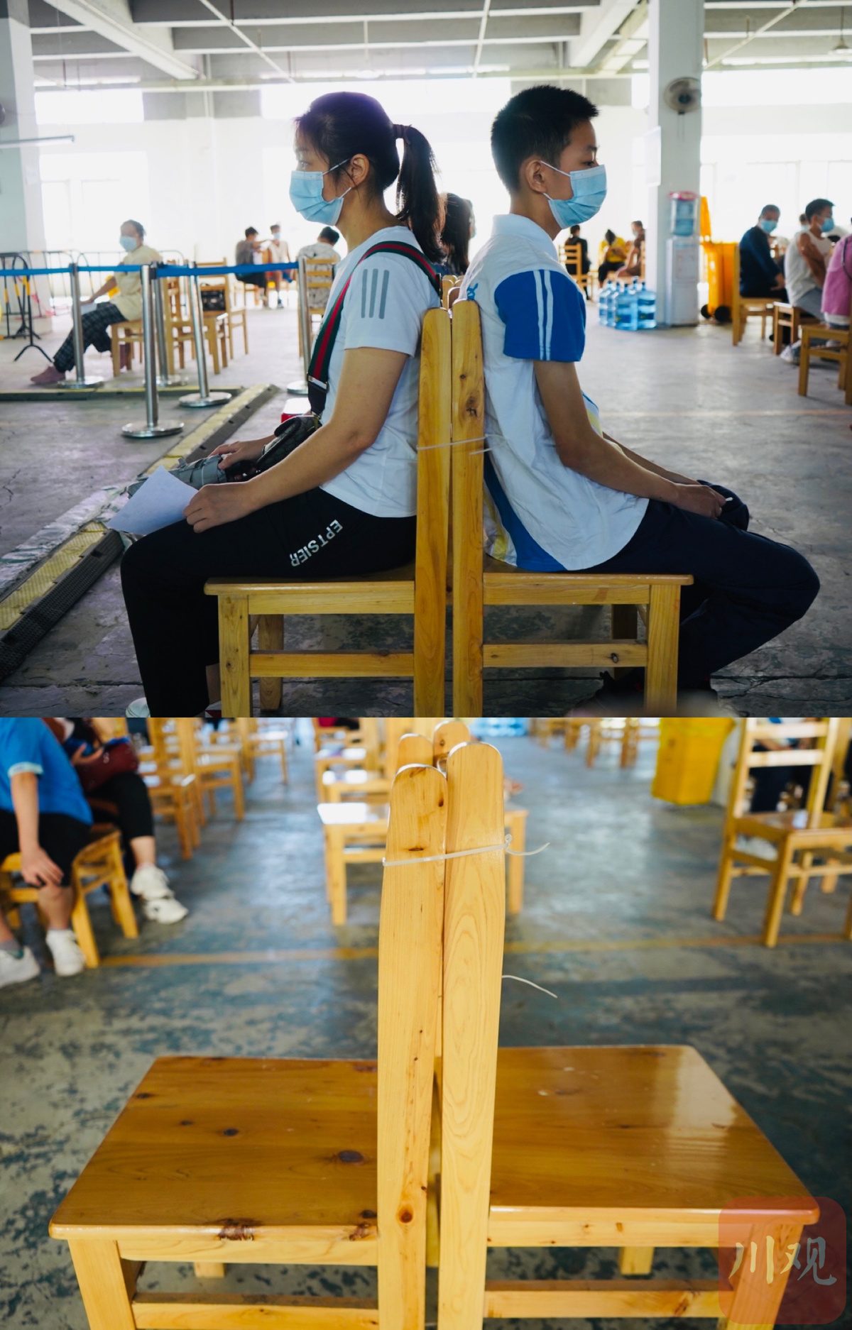 留观区内,上百把“背靠背椅子”也吸引了很多接种学生和监护人的注意。“我们此前曾经把椅子排排放,后面发现有极个别群众会把椅子打乱,在留观区聚在一起’面对面‘摆龙门阵,这样有交叉感染的风险,我们就想了’背对背‘捆绑椅子的办法。”周峰说。