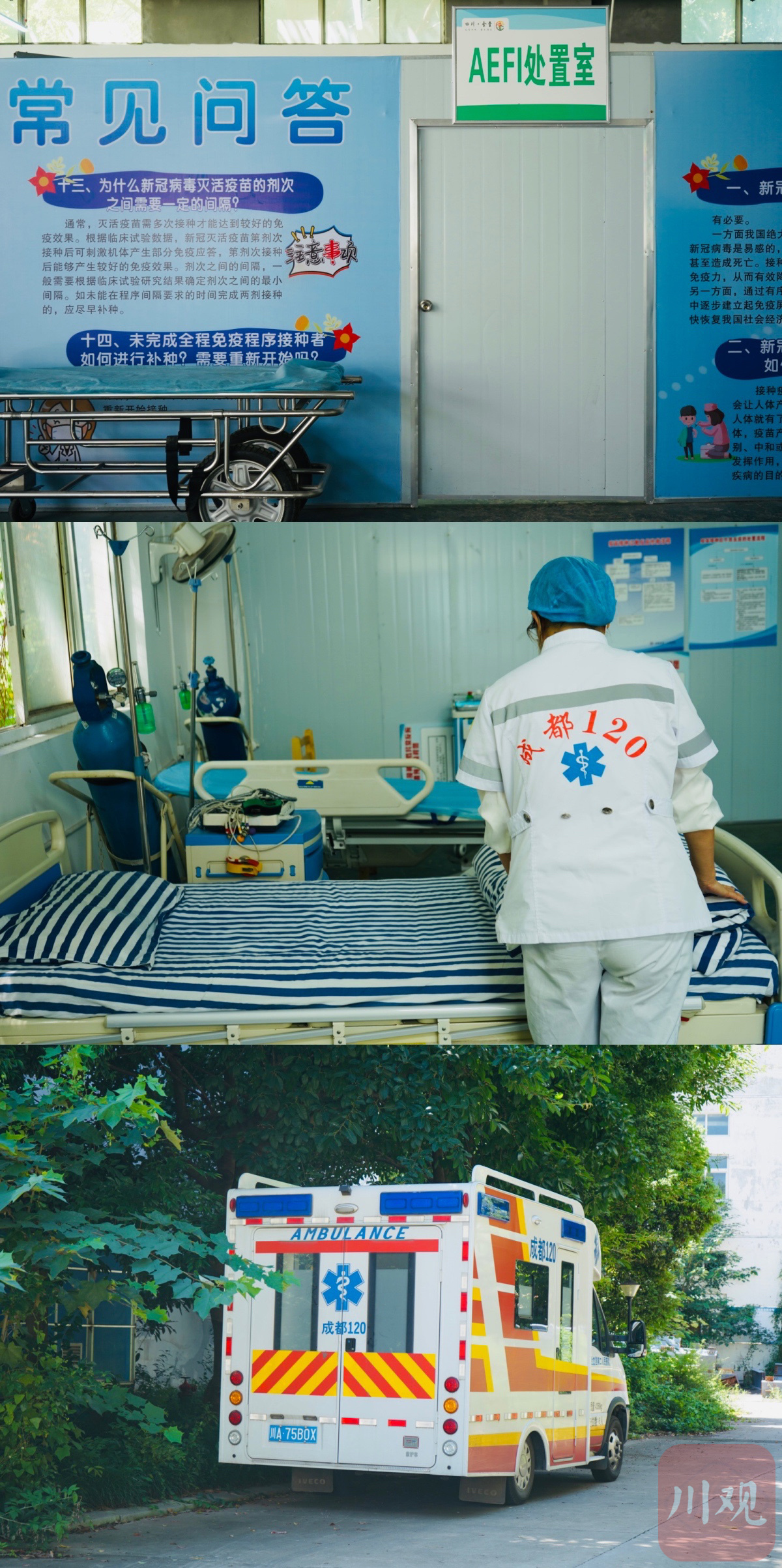 进入接种点,和大多数接种点一样,从预检、登记、接种到留观区,学生和监护人们都按照流程有序进行着。在留观区门外,也设置有AEFI处置室,一台120救护车就停靠在出口不到10米。
