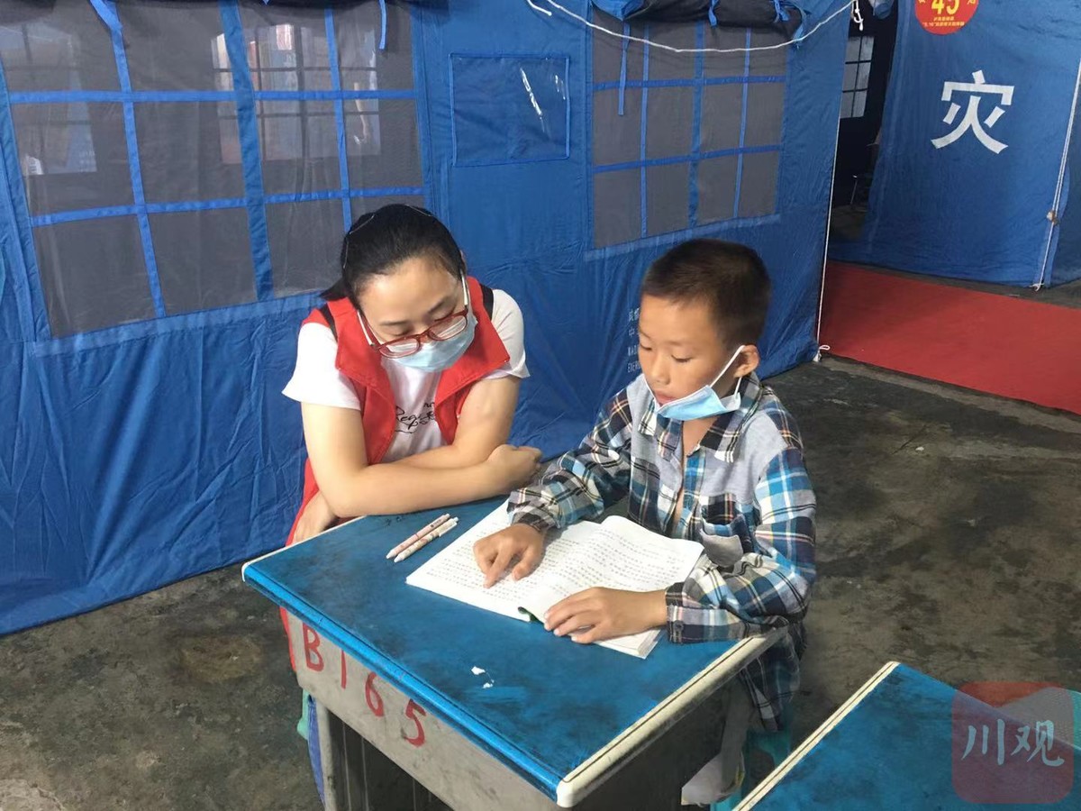 “看着他有些地方读得不是很顺,有些字还认不准,所以就坐下来指导他。”曾燕是来自泸县医保局的志愿者,也是一位1岁孩子的母亲。今天一大早,她就和单位其他几名同事一起来到安置点上,做些力所能及的事情。“孩子有爷爷奶奶在带。”