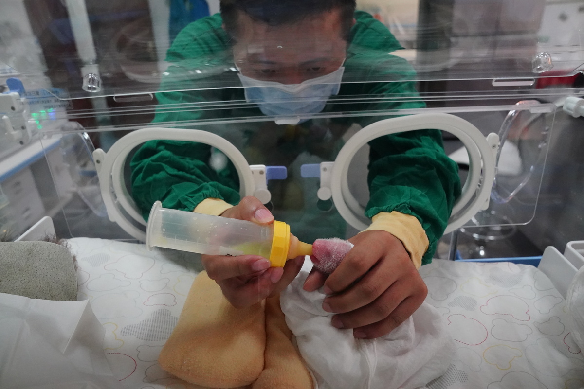据介绍,圈养大熊猫产下双胞胎以后,只能哺育其中一只幼崽,另一只则由人工育幼。繁育园旁边的办公楼,就是育幼室,育幼员正在为家美崽刺激排便,由于大熊猫是天生的早产儿,各器官发育不完全,需要外界刺激帮助其排便。