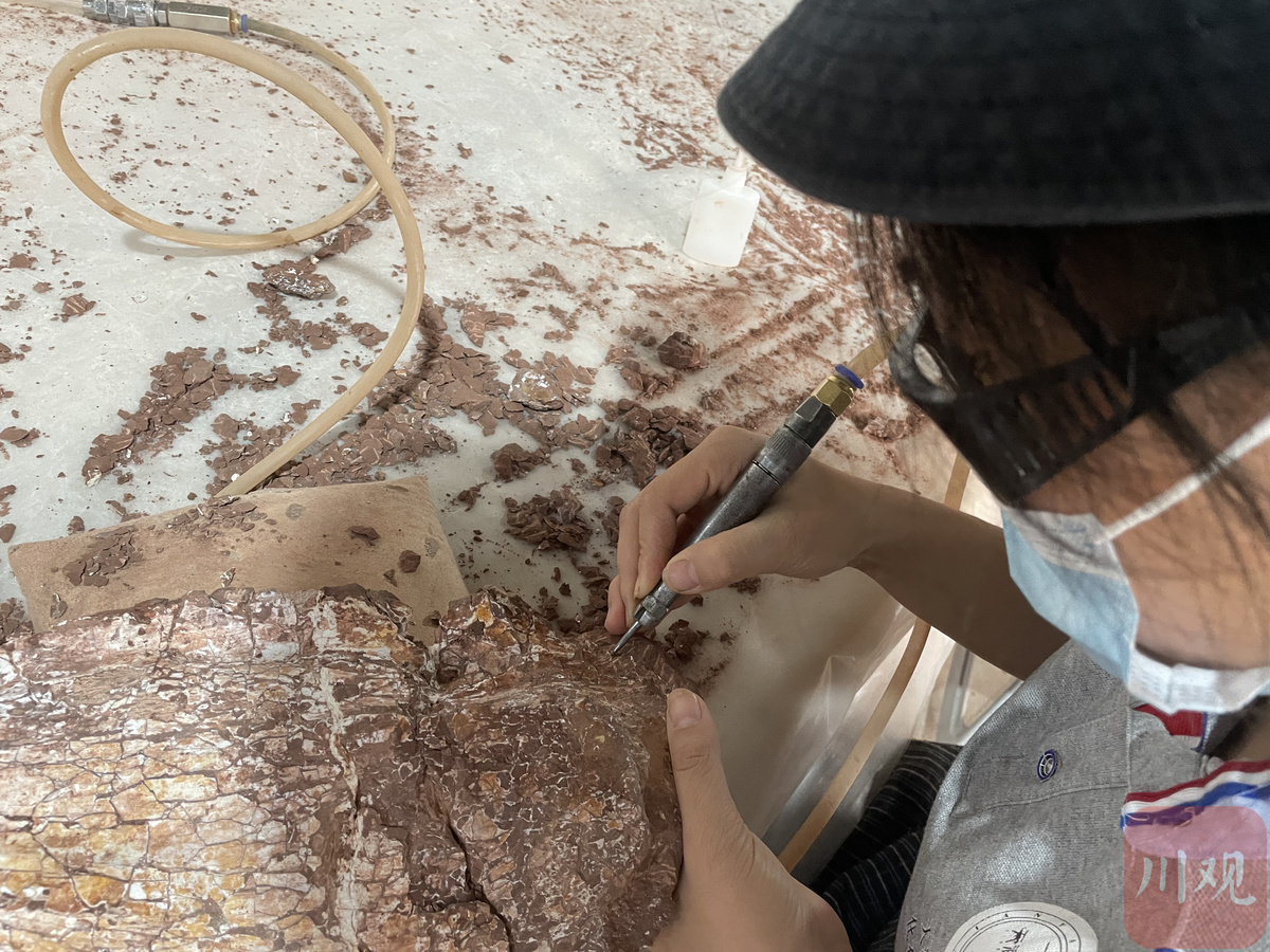 近日,记者来到位于成都崇州的天演博物馆,在展厅背后的恐龙化石修复实验室,看到了上面的一幕。“展厅的恐龙化石,基本都是这样一点点凿出来的。”天演博物馆技术总监梁鹰停下手中的活,转头对记者说,让恐龙“活”起来,要经过5个步骤,首先是野外发掘保护和初步修理,然后是室内精细修理和保护,接下来要做科学研究、骨架复原和整体复原。“最考验耐心的就是‘室内精修’,就这块骨头,一个人干,估计要花一个月。”