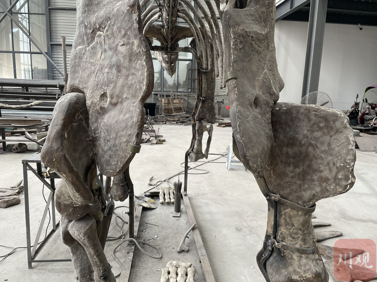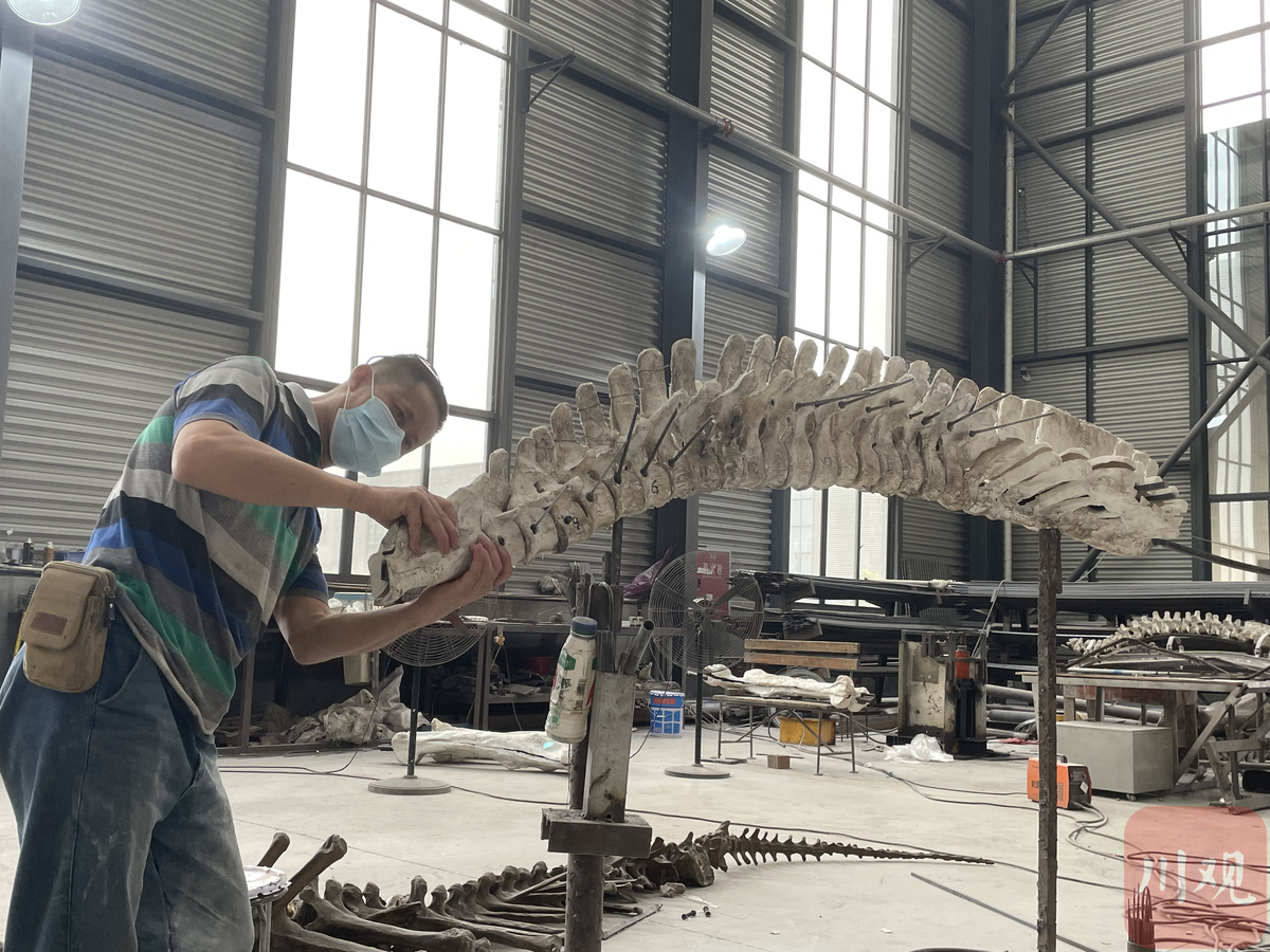 梁鹰介绍,破碎的化石,要找到原位置用胶粘好。针对缺失的部分,则要根据现有部分计算比例并绘制模型,用树脂材料复原。说起来很简单,但人类没有见过恐龙,做假肢是一个不断修正的过程。