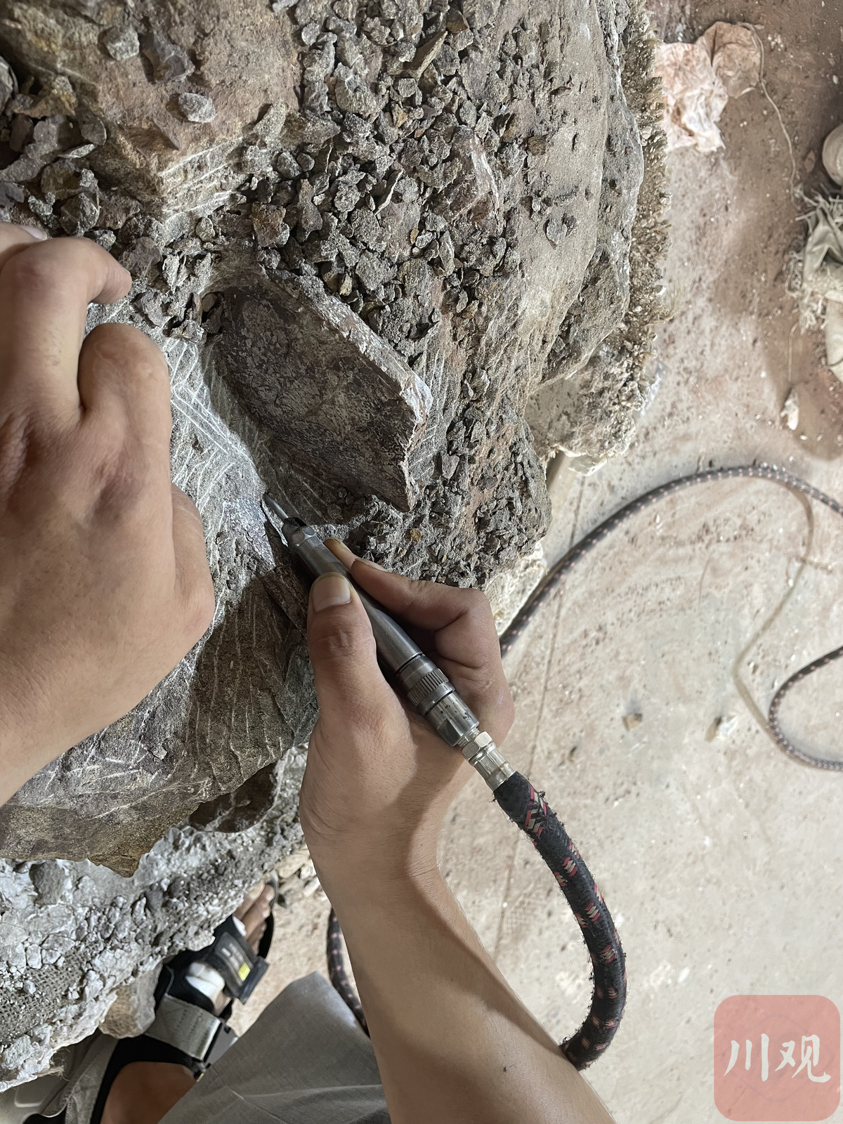 化石的野外发掘是一个由粗到细的过程。有的时候,化石在地层里就露出一点儿,下一步往哪个方向挖,如何不伤到化石,靠的全是研究人员的知识积累。“一开始可以用机器把化石外围的大块岩石切下来,等到骨骼化石露出来了,用电镐把整块石头切割下来,再给它穿一件混合了麻布片的石膏衣服,就可以送到实验室进行下一步修复了。”曾纯军介绍。