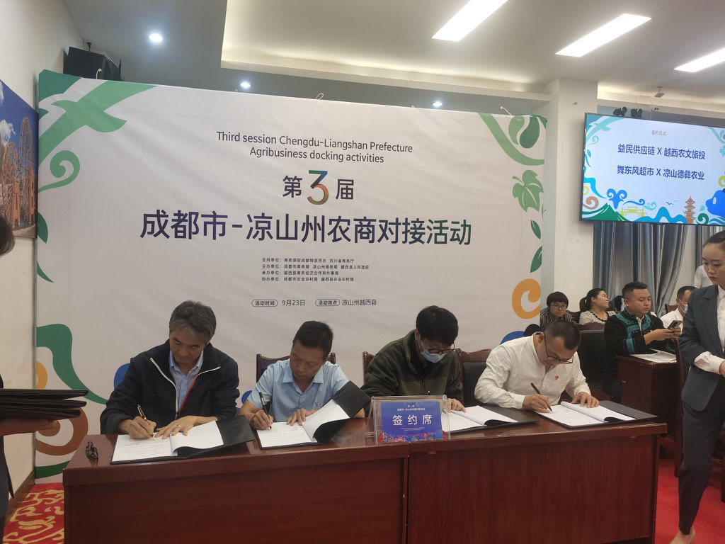 活动中,益民供应链、濛阳批发市场、舞东风超市、京东、叮咚买菜、三联家禽等来自成都的15家商超、大型批发市场和食品加工企业及流通行业协会,与越西农文旅投、绿金山农业、福银苦荞等越西县重点农特产品企业进行了深入交流,并达成采购战略合作。