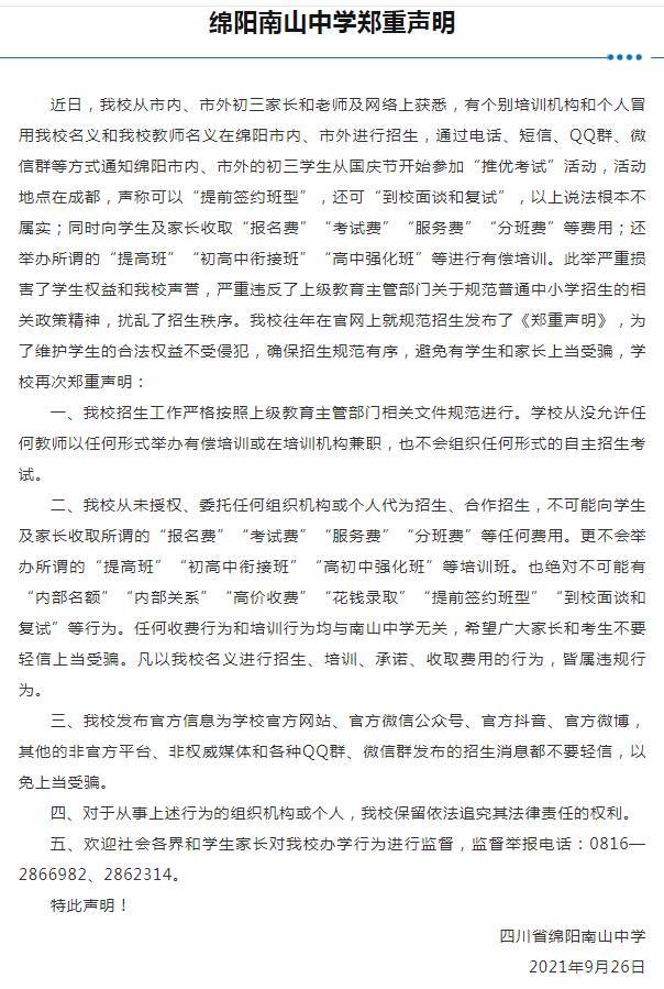 9月26日下午,绵阳南山中学发布声明称,近日,有个别培训机构和个人冒用该校名义和该校教师名义在绵阳市内、绵阳市外进行招生,通过电话、短信、QQ群、微信群等方式通知绵阳市内、绵阳市外的初三学生从国庆节开始参加“推优考试”活动,活动地点在成都,声称可以“提前签约班型”,还可“到校面谈和复试”,同时向学生及家长收取“报名费”“考试费”“服务费”“分班费”等费用,还举办所谓的“提高班”“初高中衔接班”“高中强化班”等进行有偿培训。