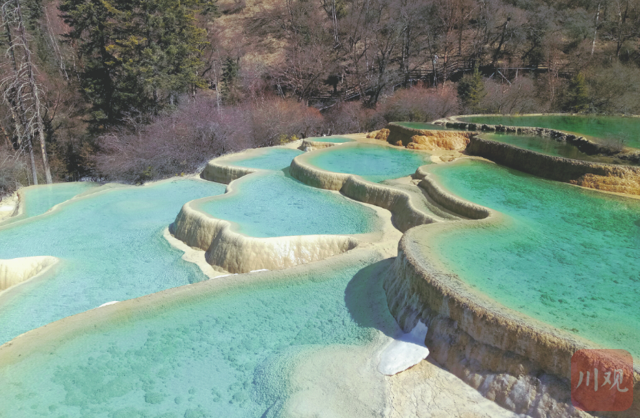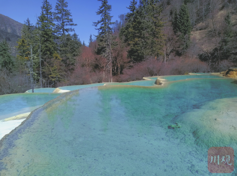 由于这里地貌侵蚀切割得特别剧烈,溪间的落差大,山地形成了2600个大小不等、水色明丽的水潭和高山湖泊,也就是我们说的“海子”和“钙化台地”。成片的山坡被黄色、乳白色钙质包裹,形成一个个奇特的盆筑状钙化池和钙化坡。