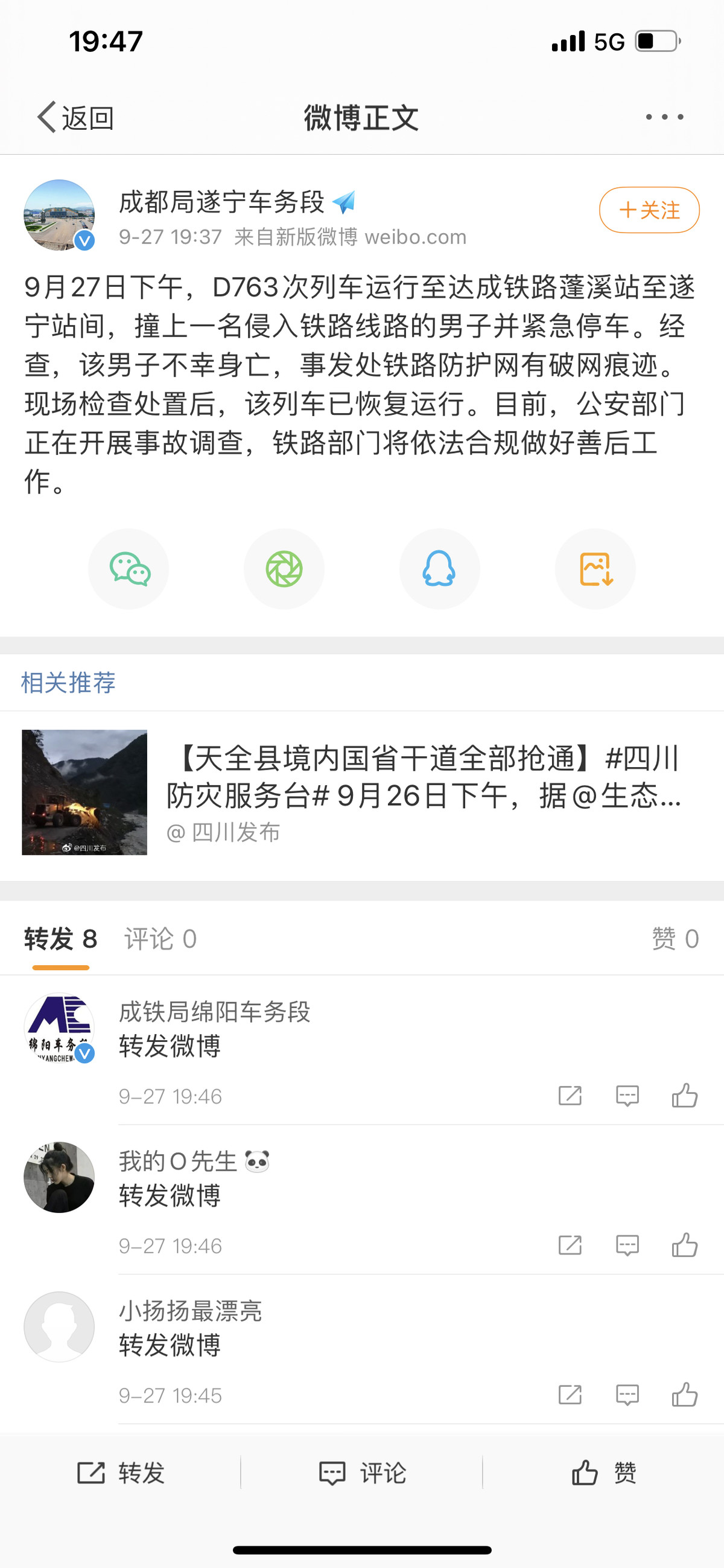 9月27日晚,成都局遂宁车务段官方微博发布信息:当天下午,D763次列车运行至达成铁路蓬溪站至遂宁站间,撞上一名侵入铁路线路的男子并紧急停车。经查,该男子不幸身亡,事发处铁路防护网有破网痕迹。现场检查处置后,该列车已恢复运行。目前,公安部门正在开展事故调查,铁路部门将依法合规做好善后工作。