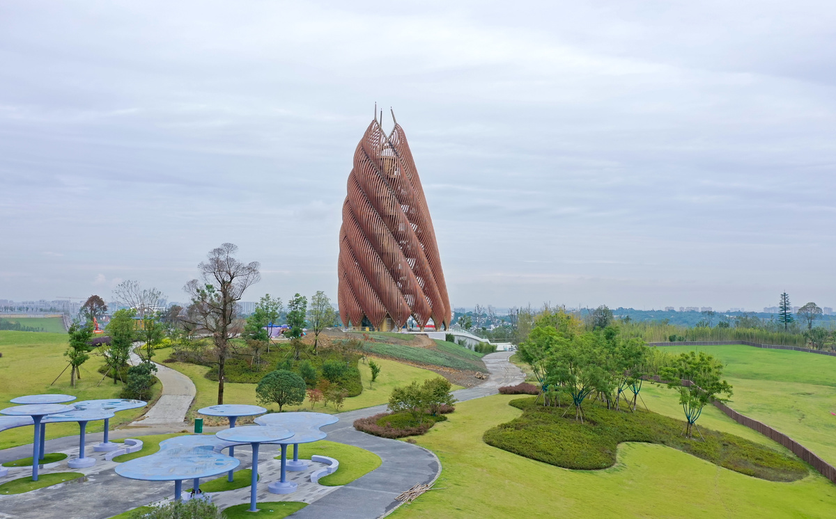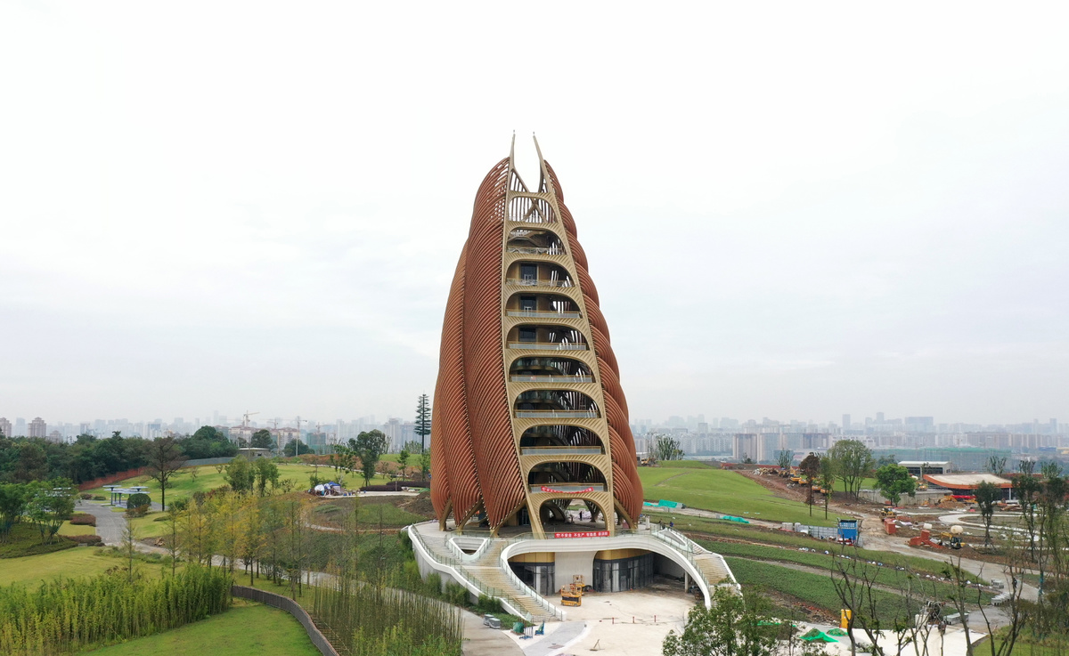 据悉,观光瞭望塔是未来成都熊猫基地的标志性景观建筑,瞭望塔高69.8米,从塔身南侧看,塔体犹如一颗破土而出的春笋;从塔身北侧观看,全塔犹如一根“剖开的笋”,造型十分独特。