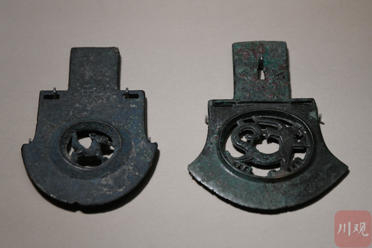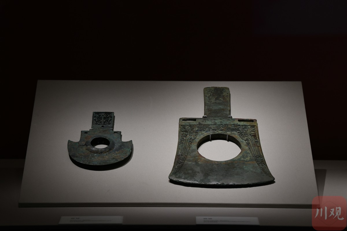 虎纹铜钺(左),1981年四川省南充市阆中彭城坝出土和镂空虎纹铜钺(右),1964年陕西省汉中市成固县五郎镇五郎村出土