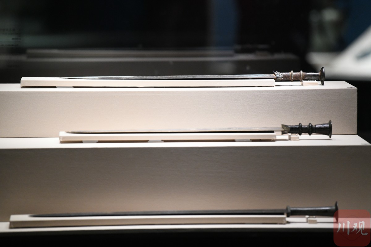 自上而下依次是吴王夫差剑(苏州博物馆藏)、越王州勾剑(荆州博物馆藏)、越王不光铜剑(荆州博物馆藏)