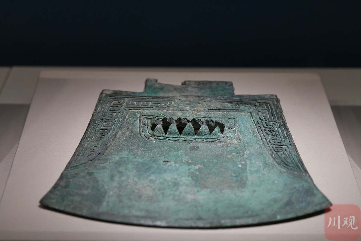 1989年江西新干县大洋洲商墓出土的铜钺,器身中间上部有一形近阔嘴的长方形镂空,露出两排三角形利齿,上六下五共11颗