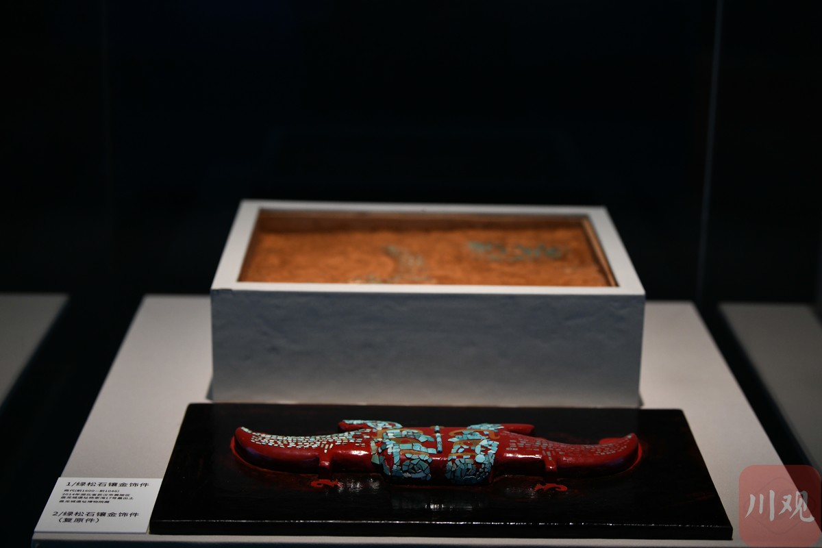 绿松石镶金饰件及绿松石镶金饰件(复原件),商代(前1600—前1046),2014年湖北省武汉市黄陂区盘龙城遗址出土