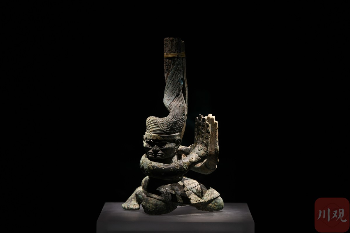 2021年三星堆遗址出土的铜跪坐人像。铜像尤其对手部和足部细部特征的把握十分精细,展现出三星堆青铜人像铸造艺术的高超水平