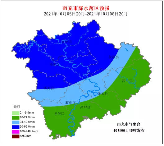 10月5日15时,南充市气象台发布暴雨蓝色预警:预计5日夜间到7日上午,南充市有一次强降雨天气过程,过程中伴有短时强降水和阵性大风,其中5日夜间到6日白天,阆中、南部、西充、仪陇有大雨到暴雨(40-80mm),局部大暴雨(120-160mm),最大小时雨强20-40mm;6日夜间-7日上午,三区、仪陇、蓬安、营山有大雨到暴雨(30-70mm)。
