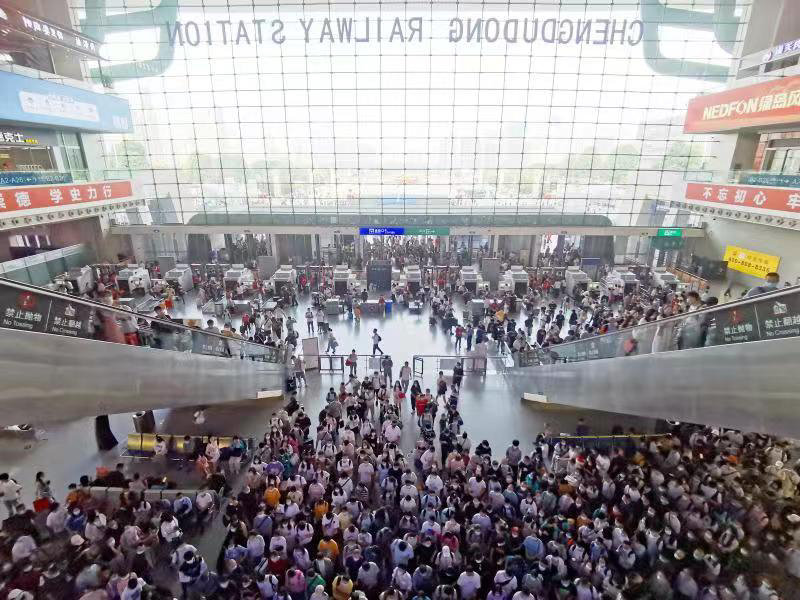 成都车站则在10月1日、国庆大假第一天,迎来客流高峰,全站共计发送旅客46万人次,略高于今年5月1日旅客发送量,创车站历史最高客流。