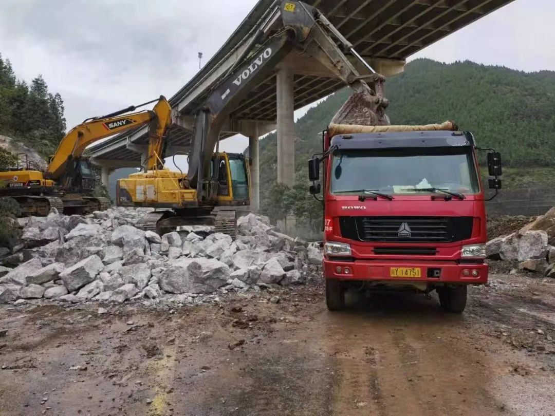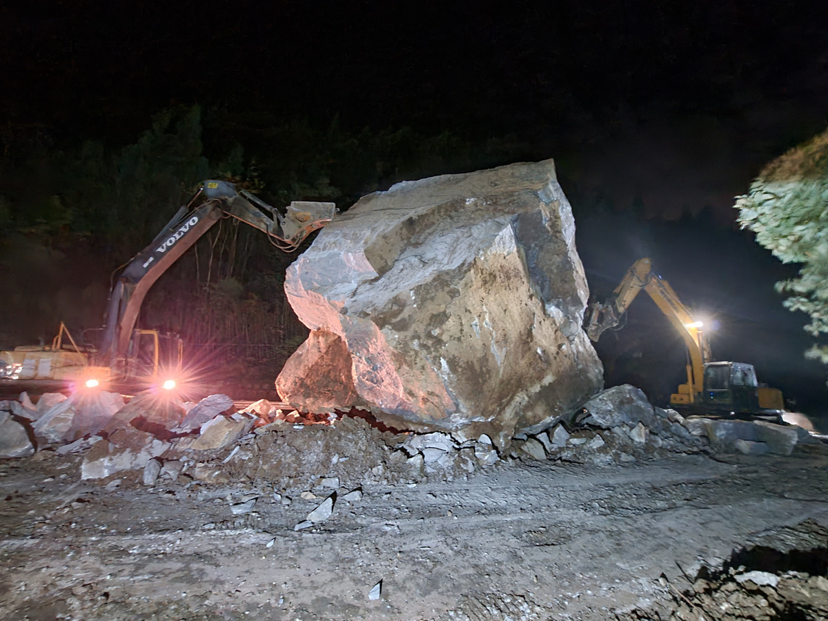 10月6日晚至7日,朝天区交通运输局现场准备3台、1台装载机,10辆货车等抢险设备,30余名工作人员开展抢通工作,对巨石开展机械破碎。经过连夜奋战,截至7日下午4时,长约20米,宽约13米,高约6米的巨石已破拆三分之二。
