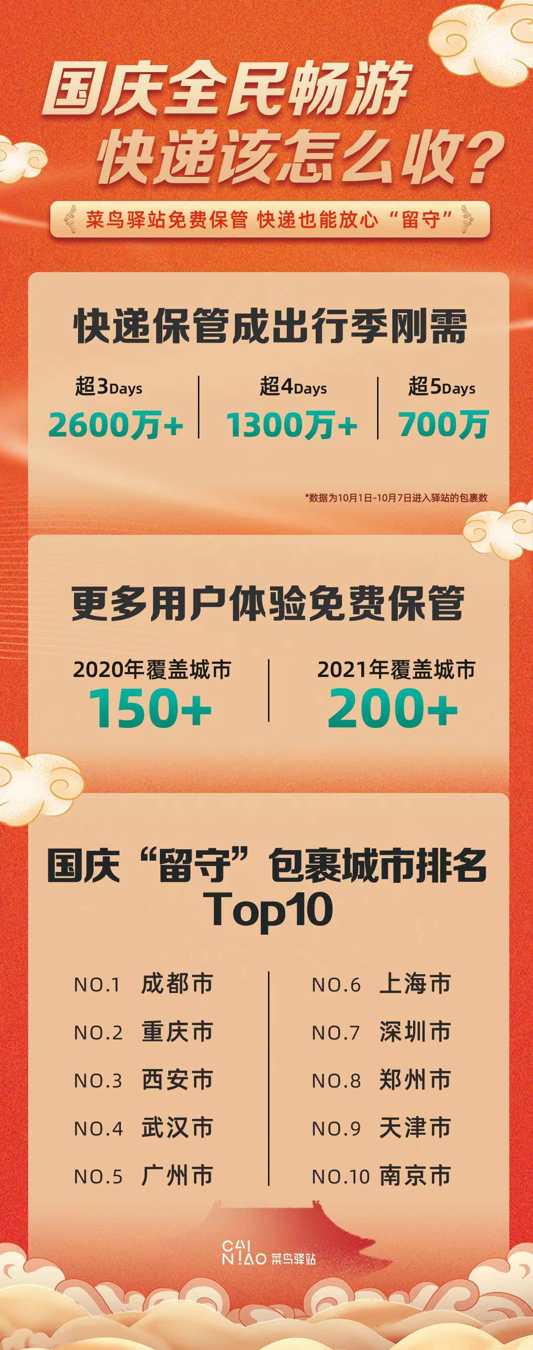 这个国庆长假,全国安心出游同时,快递也在放心“留守”。10月8日,菜鸟驿站数据显示,国庆期间共有2600万件快递保管超过3天,全国近700万件快递保管超5天。成都成全国最大快递“留守”城市。