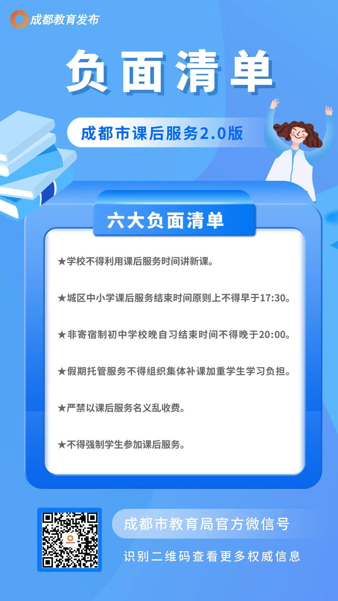记者从成都市教育局获悉,近日,市教育局、市发改委、市财政局和市人社局联合印发《关于深化中小学课后服务提高课后服务水平的通知》,明确提出,全市义务教育阶段学校要进一步提高课后服务水平,全面实施“托管+拓展”课后服务模式,更好地满足学生个性化发展需求,实现义务教育学校全覆盖、有需求的学生全覆盖,促进学生全面健康成长。成都市中小学课后服务2.0版全面开启!