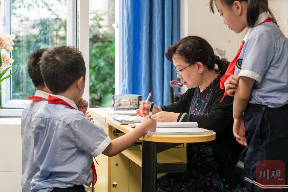 成都泡桐树小学三年级五班班主任孟会贤,正在延时服务为学生批改作业 卢春阳 摄影