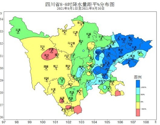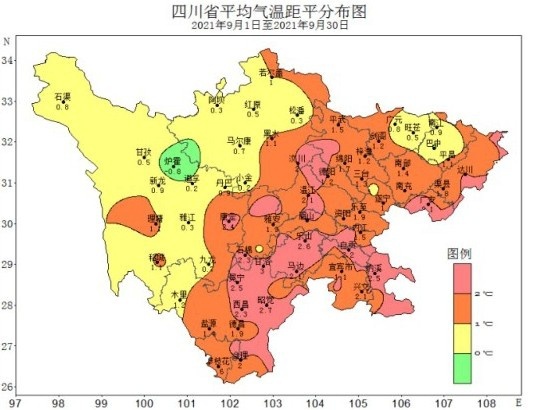气象观测显示,9月,四川全省平均气温21.3℃,偏高1.6℃,位列历史同期第2高位(同期最高出现在2009年21.7℃)。全省156个国家气象观测站中,有36站平均气温位列历史同期第1高位,大部分位于盆西和盆南;全省平均降水量192.3毫米,偏多50%,位列历史同期第5多位,井研、三台、乐至、南部、万源、通江和广元等7站降水量位列历史同期第1多位。
