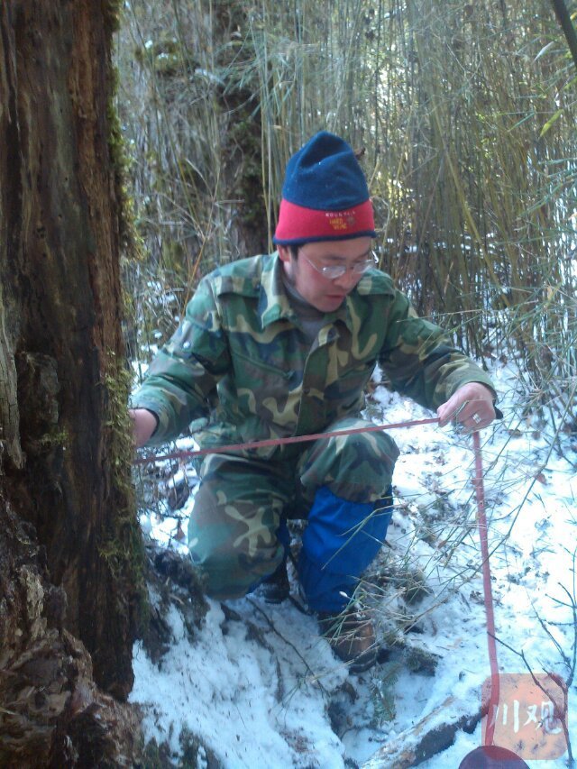 大熊猫国家公园王朗片区,巡护员测量嗅味树数据
