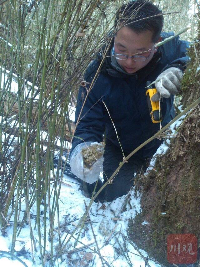 大熊猫国家公园王朗片区,巡护员采集熊猫粪便