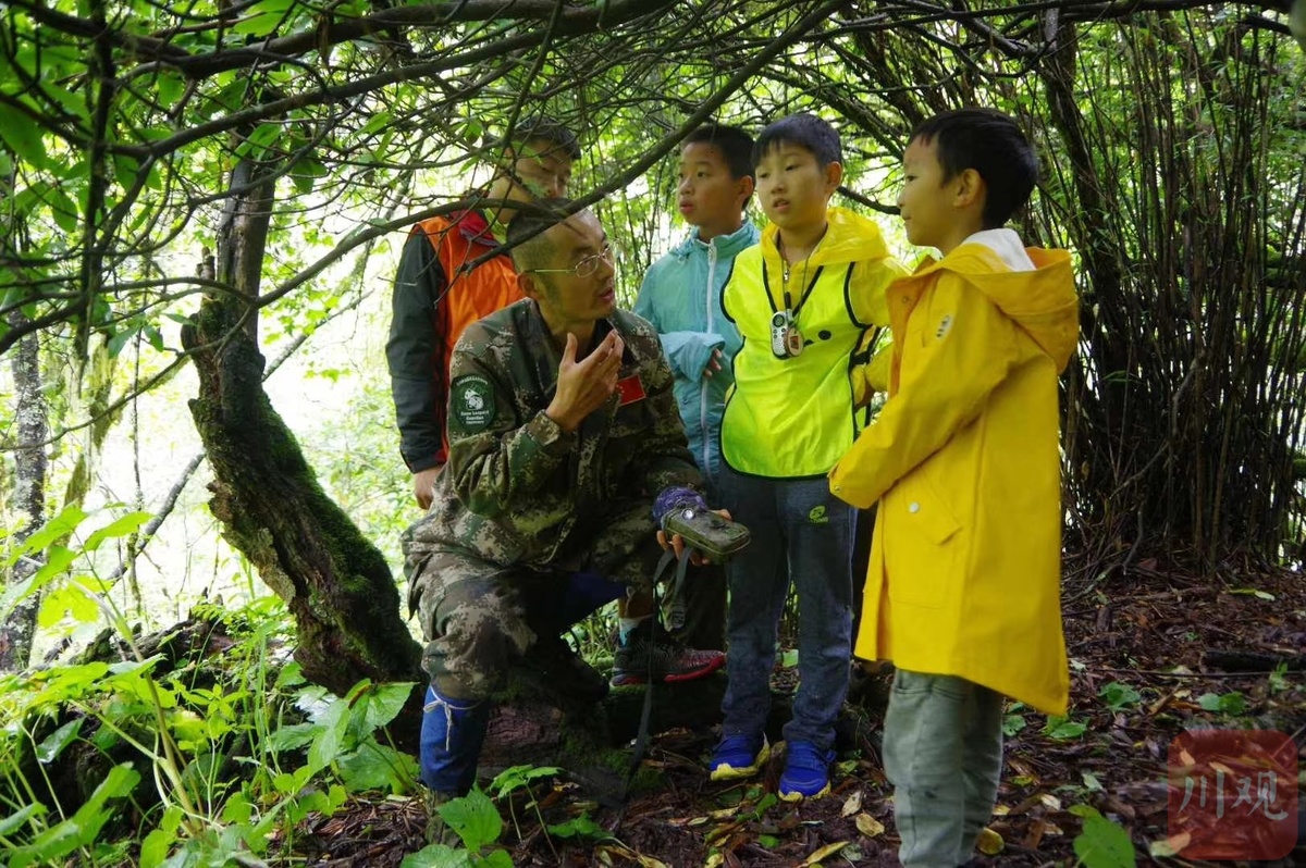 大熊猫国家公园卧龙片区,野外工作者给孩子们讲解森林知识。
