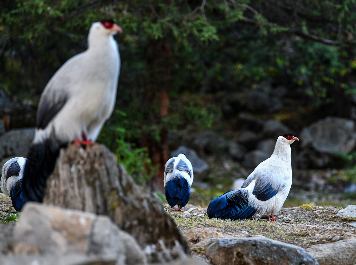 在森林中生活的白马鸡群。