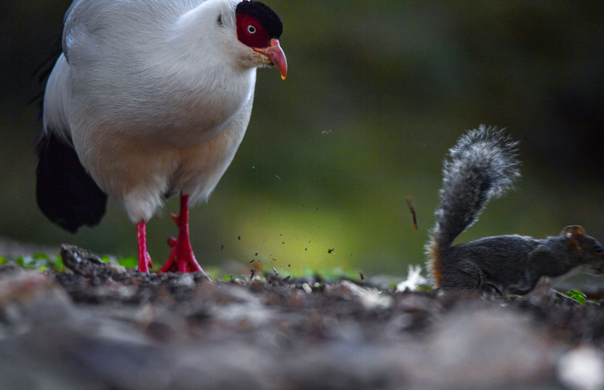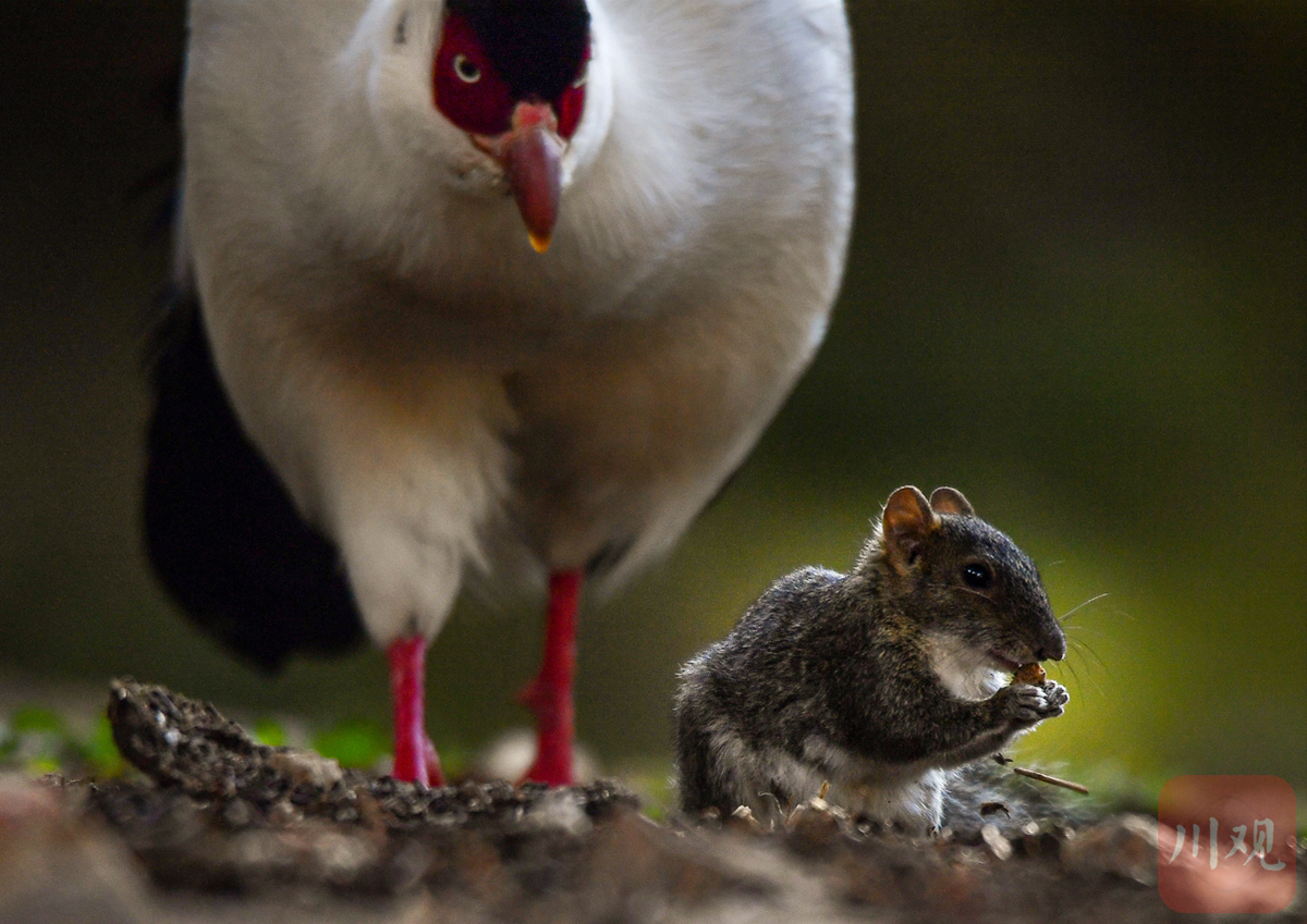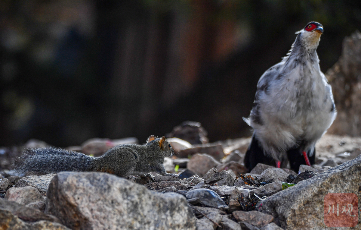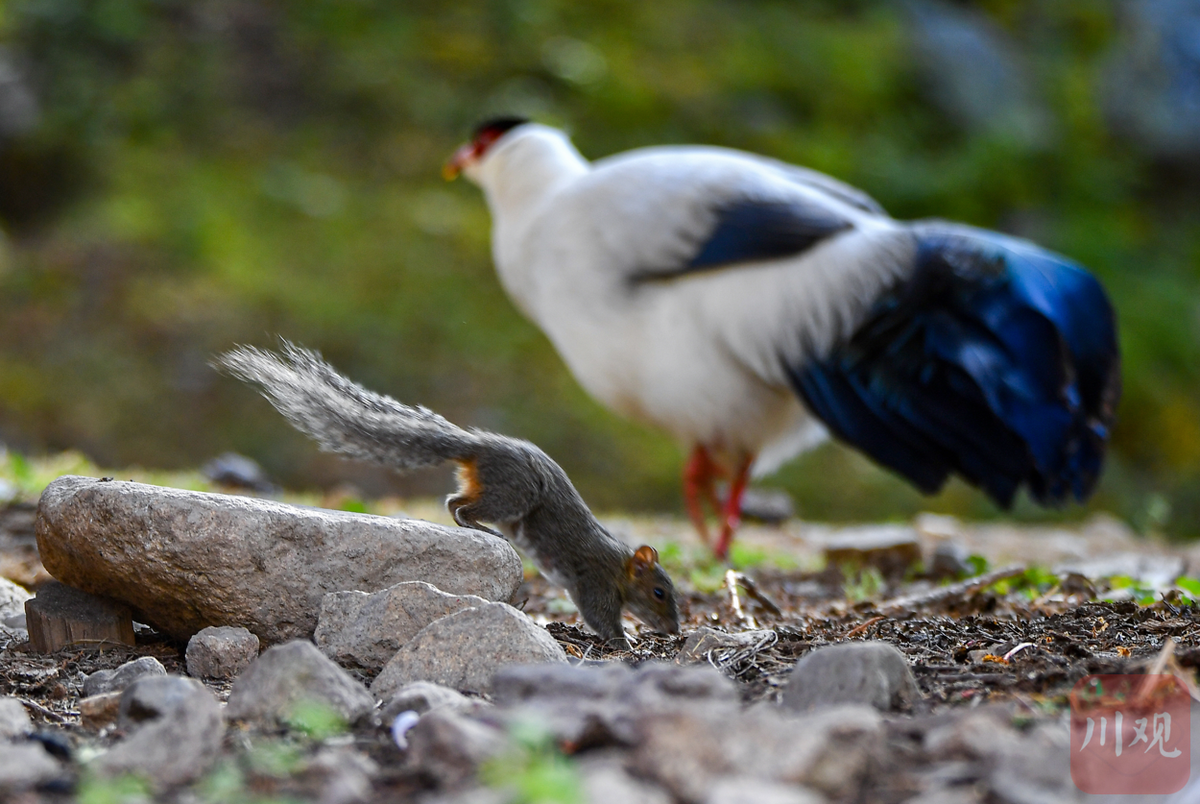 在白马鸡的眼皮子底下松鼠啃起了食物。