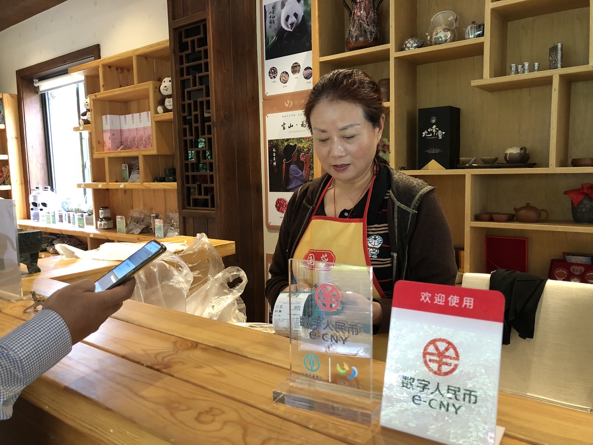 半盏山房是宝山村打造的精品网红民宿。记者在宝山村采访,刚好碰到从成都来这里旅游的王阿姨,退房时民宿老板沈光富向她推荐使用数字人民币支付,满100元减50元,498元的房费只需支付448元。王阿姨欣然接受。“只要是试点地区来的游客,我都会尽量推荐他们下载APP,使用数字人民币付款,对游客来说有优惠,对我来说也方便。”沈光富说。