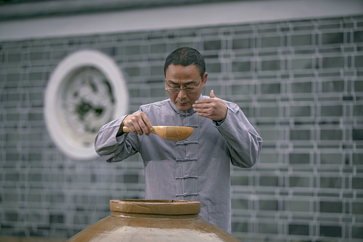 “经过三年手工晒制的晒醋有三大特色,一是浓稠,可将晒醋直接挂在墙上,可谓底蕴十足;二是颜色为自然沉淀的深褐色,色泽均匀通透;三是原汁原味的原香,既有历史的厚重感,又有由内到外的自然醇香,越品越有回味。” 自贡千天百味食品有限公司负责人刘家臻说。