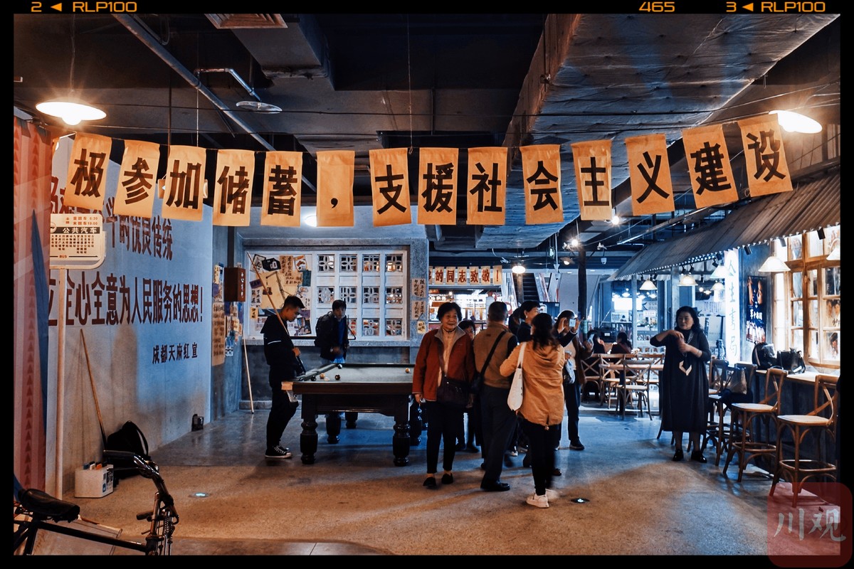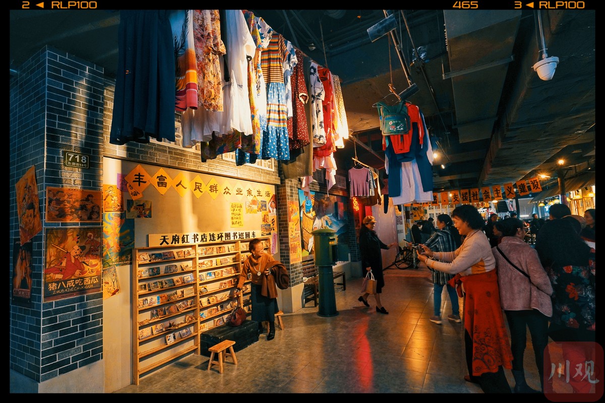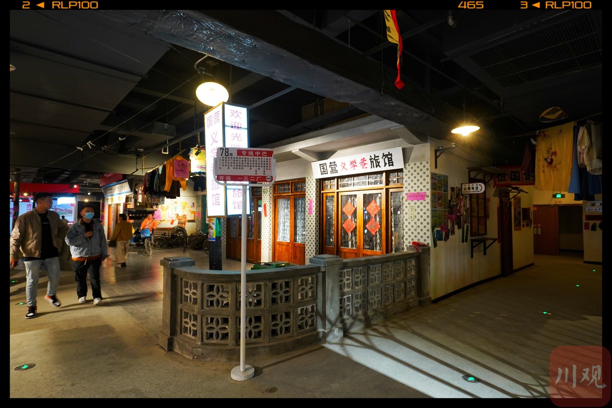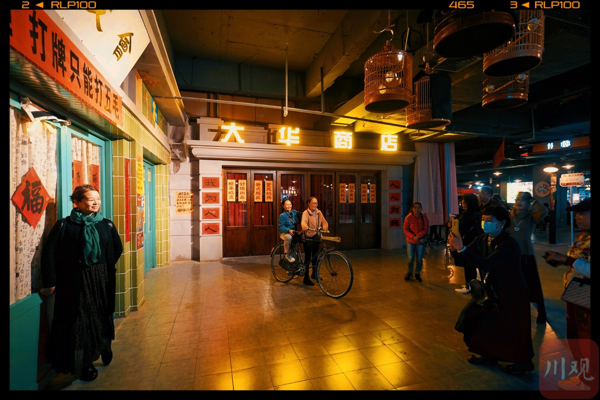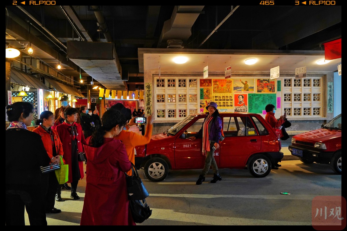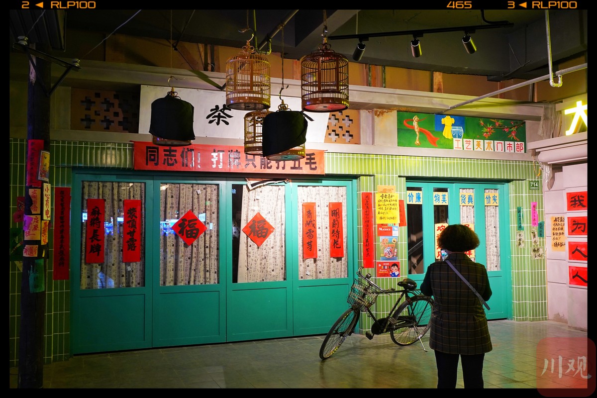 水磨石和三合土的地面,榆木电桩上的钨丝灯泡泛着橘色灯光,染坊街、科甲巷、八宝街…… 复原的路牌以及多个公交车站点、站牌都是比照原版复制,录像厅的灯箱、门市部、电子游戏厅的招牌,街机、台球桌和大红奥拓出租车都是那么地扎眼。“快去给你女儿打电话,对,就这个姿势。”笑声中,两鬓斑白的张大爷举着手机给李嬢嬢拍着照。“很多当年的生活细节还原的很像,晾衣杆上的各式衣服,小人书摊位那个时候就这样的,当年的小朋友就是一两分钱在书摊翻一天的小人书。”张大爷说:“我家就住在新南门附近,1971年我下乡去攀枝花了,2016年才退休回到成都,孩子她妈就是这样用公用电话给女儿打电话的。”“还有这些悬挂、张贴的标语,简直就像回到了从前,满满的回忆。”接话的李嬢嬢很是兴奋。
