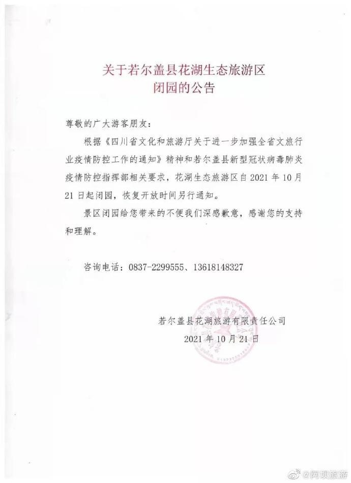 另据@阿坝旅游10月21日消息,根据《四川省文化和旅游厅关于进一步加强全省文旅行业防控工作的通知》精神和若尔盖县新型冠状病毒肺炎疫情防控指挥部要求,花湖生态旅游区自2021年10月21日起闭园,恢复开放时间另行通知。