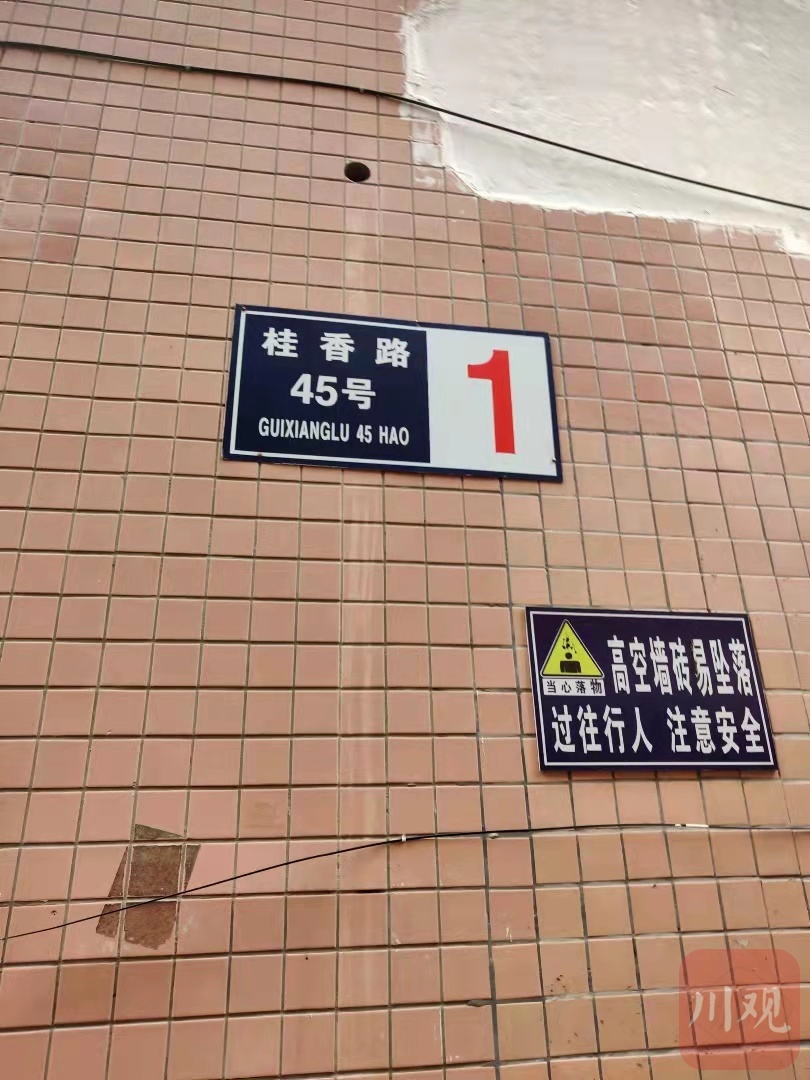 楼栋墙上贴有“高空墙砖易坠落,过往行人,注意安全”的提示。