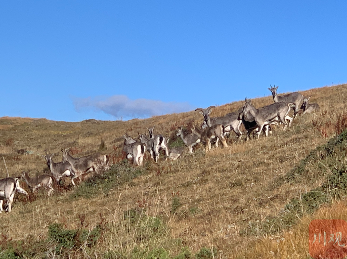 近日,道孚县七美乡干部在白日山村偶遇国家二级重点保护动物岩羊。40余只肥壮的岩羊,在头羊的带领下,迈着六亲不认的步伐,从白日山头欢快的向着山间奔来。岩羊见到生人也不害怕惊慌,时而小跑,时而漫步,有的站立眺望远方,有的与朋友“窃窃私语”,有的时不时回头看看拍照的人,像是在问有没有把我照漂亮?