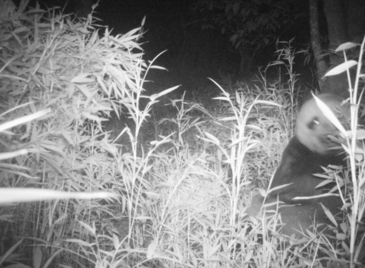 在视频中可以看到,在伸手不见五指的一个夜晚,一只熊猫滚滚席地而坐,左薅右拽,大把大把地往嘴里塞竹子,活脱脱的“干饭人”吃夜宵画面。