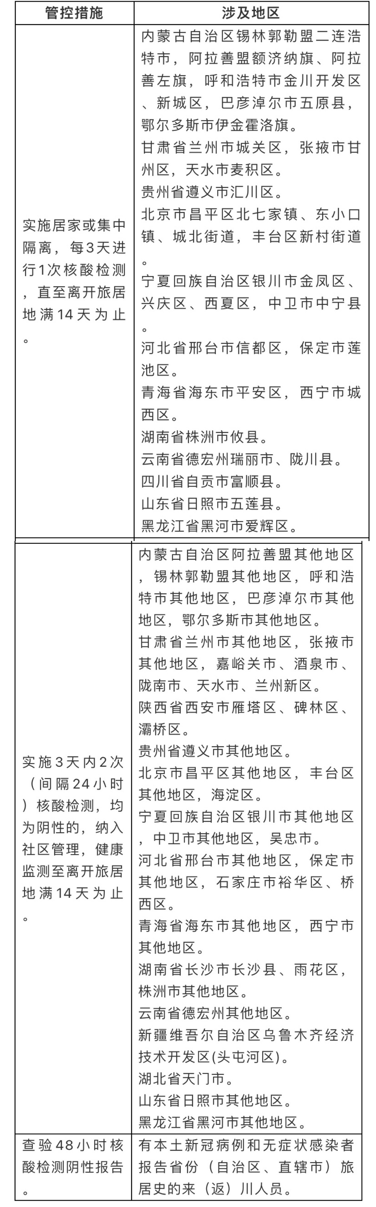 国内部分地区来(返)川人员管控措施