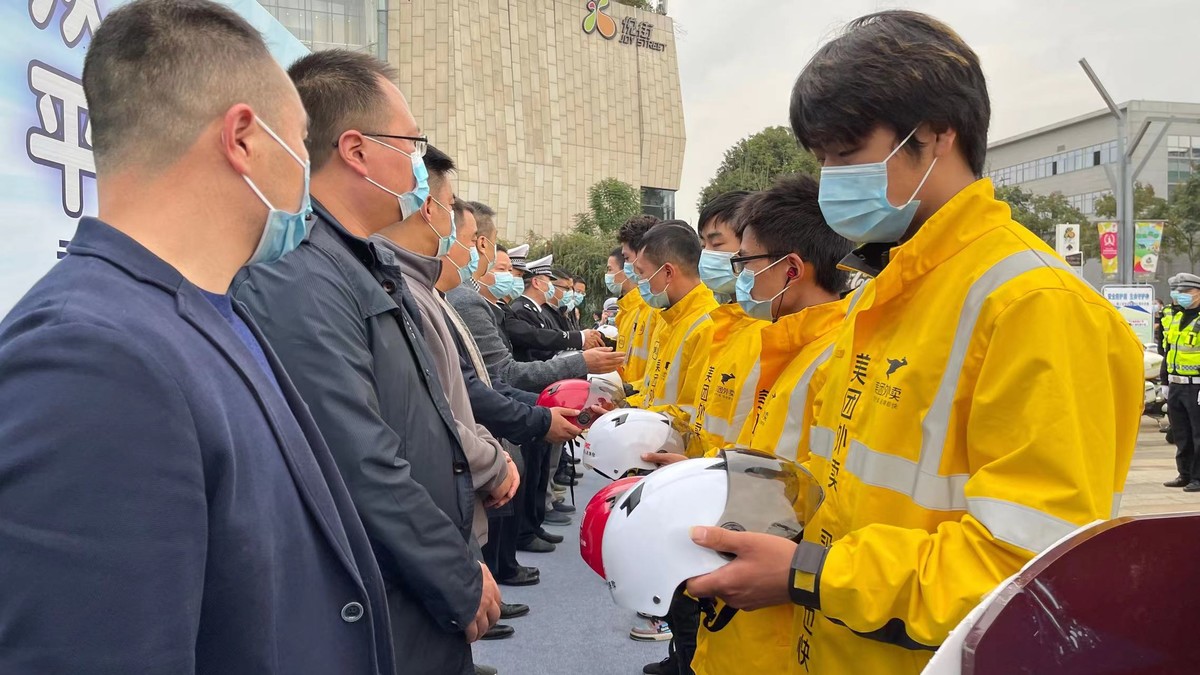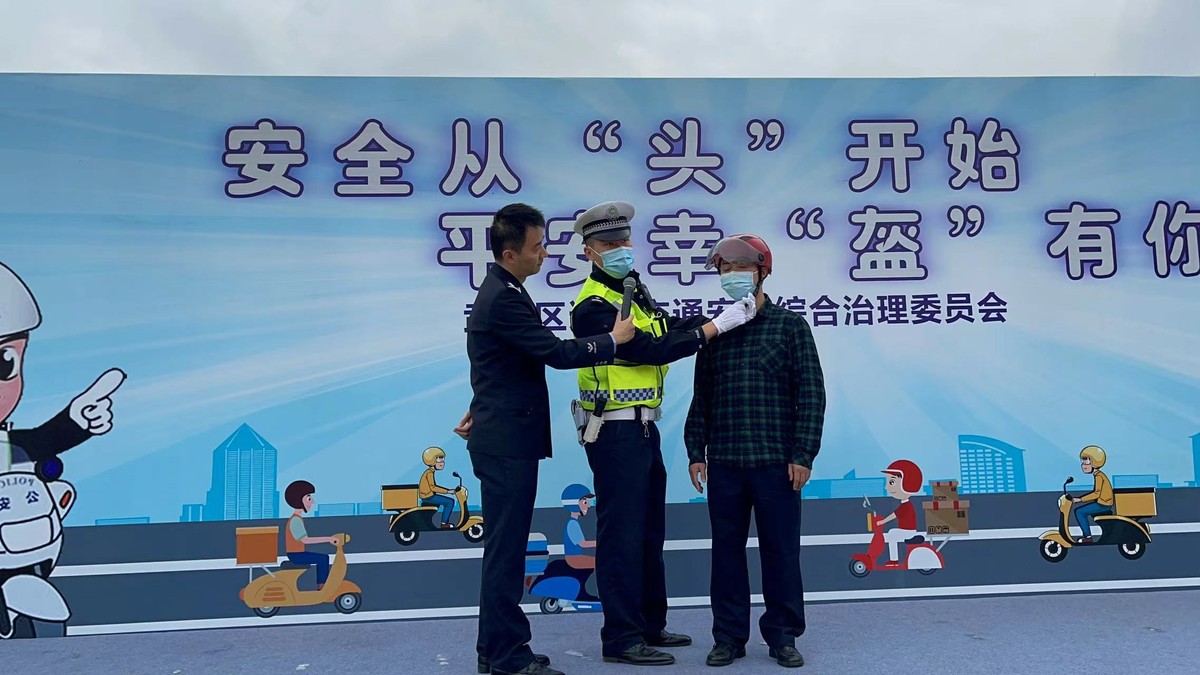 活动最后,交警一分局二大队大队长陈一哲与现场群众代表上台演示正确佩戴头盔方式。从头盔大小的选择、佩戴在头部的位置调整、系扣的方式和力度都细心讲解到位,获得了现场群众的一致好评。讲解结束后,还举行了头盔赠送仪式,参与活动的各部门领导为现场外卖骑手逐一赠送头盔,将关心和安全传递到每个人手上。