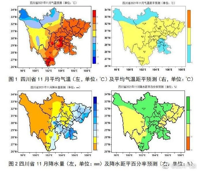 预计11月,阿坝州、甘孜州北部、宜宾、泸州、自贡、内江平均气温较常年同期偏低0.5~1.0℃,省内其余地区平均较常年同期偏高0.5~1.0℃;降水方面,阿坝州、成都、德阳、绵阳、广元、雅安、乐山、眉山及盆地西部沿龙门山一带有强降水集中时段。