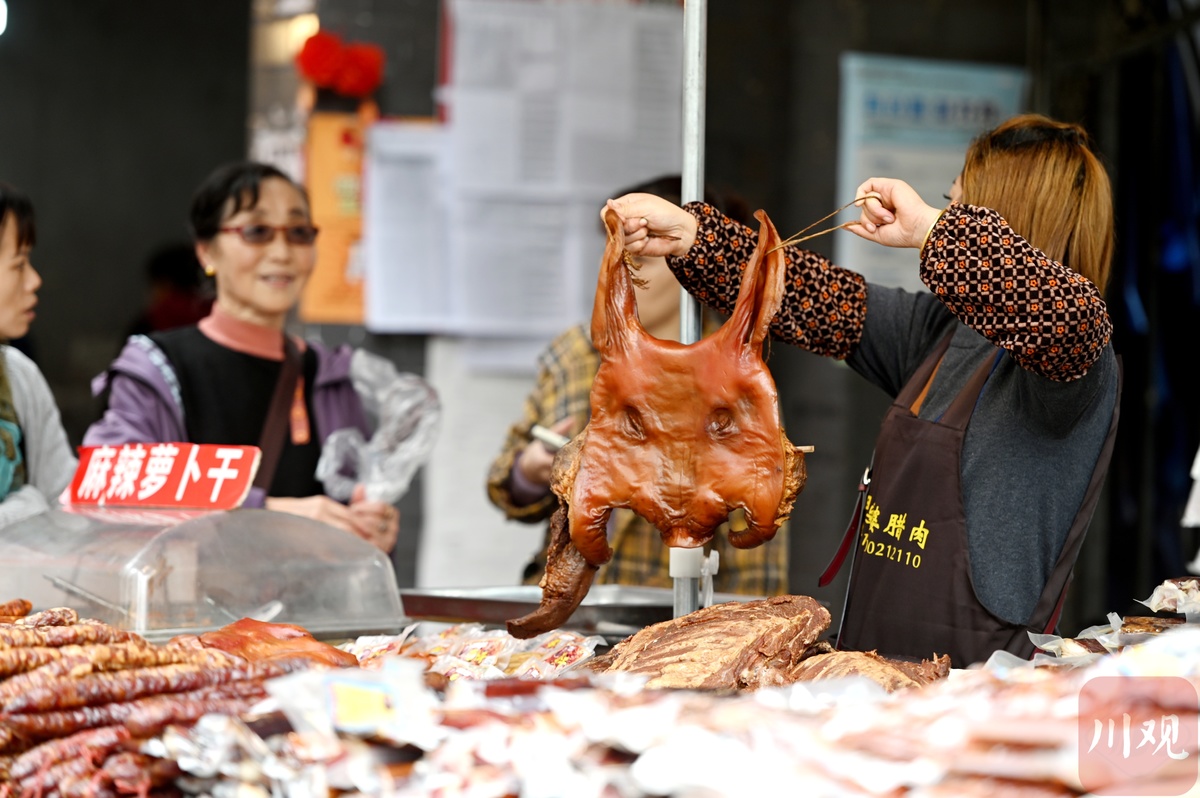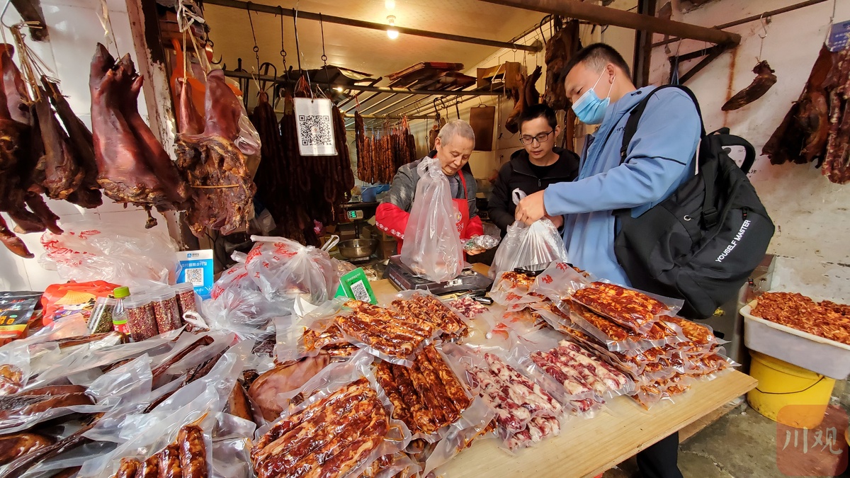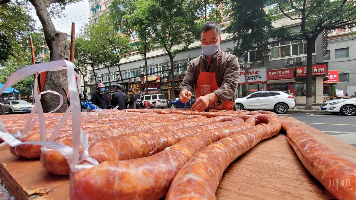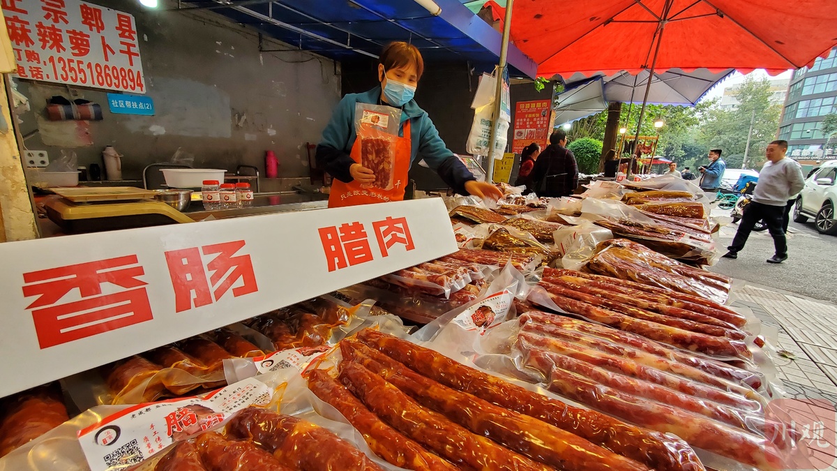 “这个要煮50分钟,这个要煮30分钟……煮出来好吃些,蒸出来吃着有些干。”作为“香肠一条街”的“头部顶流”,王大爷这段时间特别忙,他刚把灌好的香肠挂出来“透气吹风”,又马上给外省来的顾客讲解不同腊制品的烹饪方法。“这辈子没有这么早灌过香肠。”王大爷说,10月份的成都气温降得很“凶”,而较低的气温对灌香肠非常有利,他和这些做香肠腊肉生意的邻居们就一起商量,干脆大家一起把灌香肠的时间提前了。