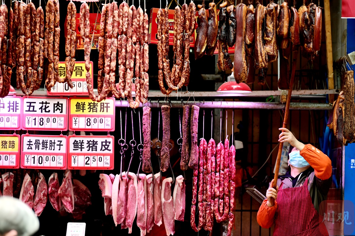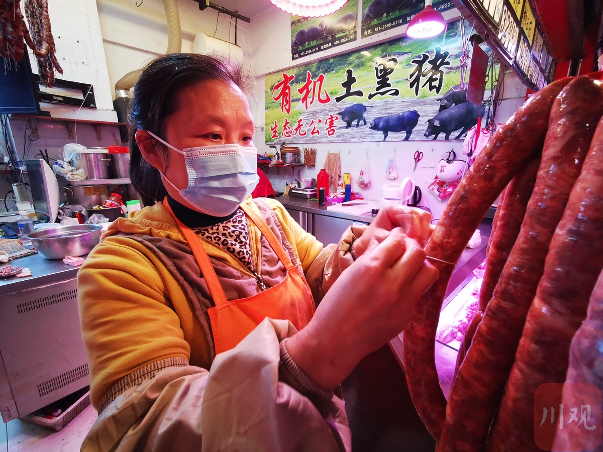 说到价格,川观新闻记者有意打探了一番,以腊香肠这个单品来说,新开寺街与北东街相交处的一家冷鲜肉店做到了当日“探底”——干香肠38元一斤。