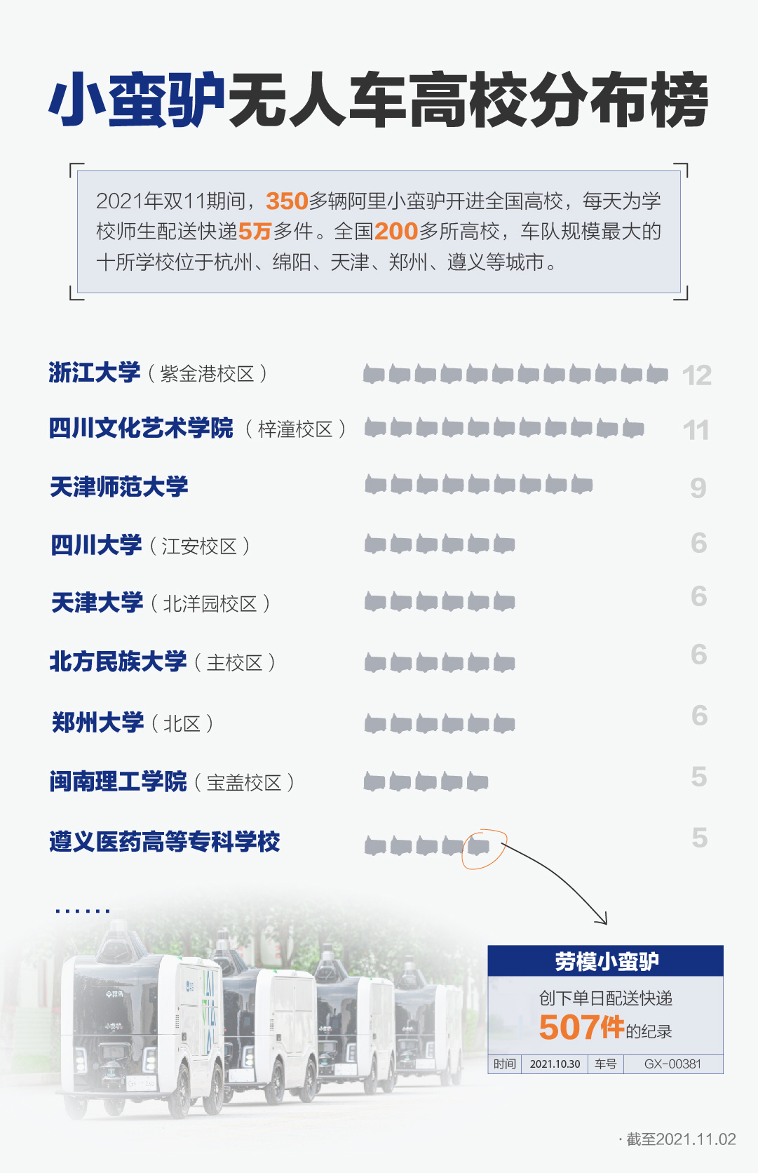 阿里达摩院相关负责人介绍,双11小蛮驴预计配送快递超100万件,让高校师生省时省力地收取包裹。小蛮驴还在四川、浙江的高校试点外卖配送服务,将食堂饭菜送往宿舍楼、行政楼等校内点位。