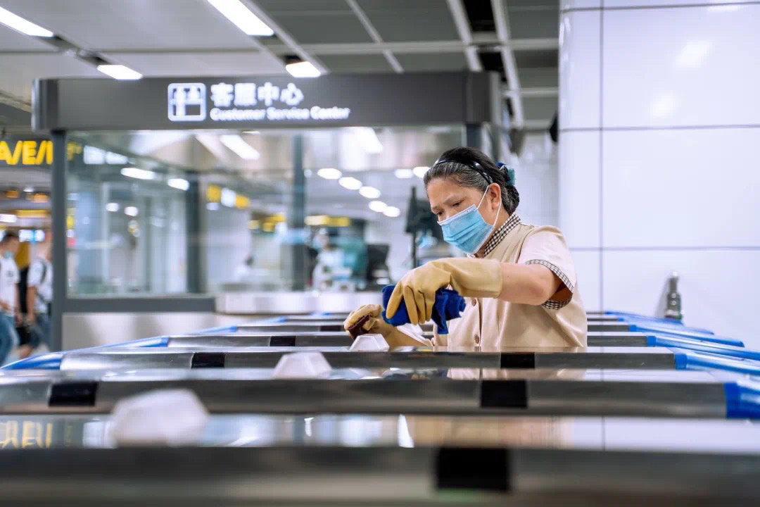 成都地铁严格按照防控要求做好消杀、通风、防护等工作,持续加强疫情防控。每4小时对乘客频繁接触的设备设施进行一次消毒工作,如安检机、自动售票机、闸机等;每6小时对乘客易接触的设备设施、乘客接触区域进行一次消毒工作,如楼扶梯扶手、座椅、地铁站出入口、站台、公共卫生间等;定期对车站空调、单程票进行消毒。