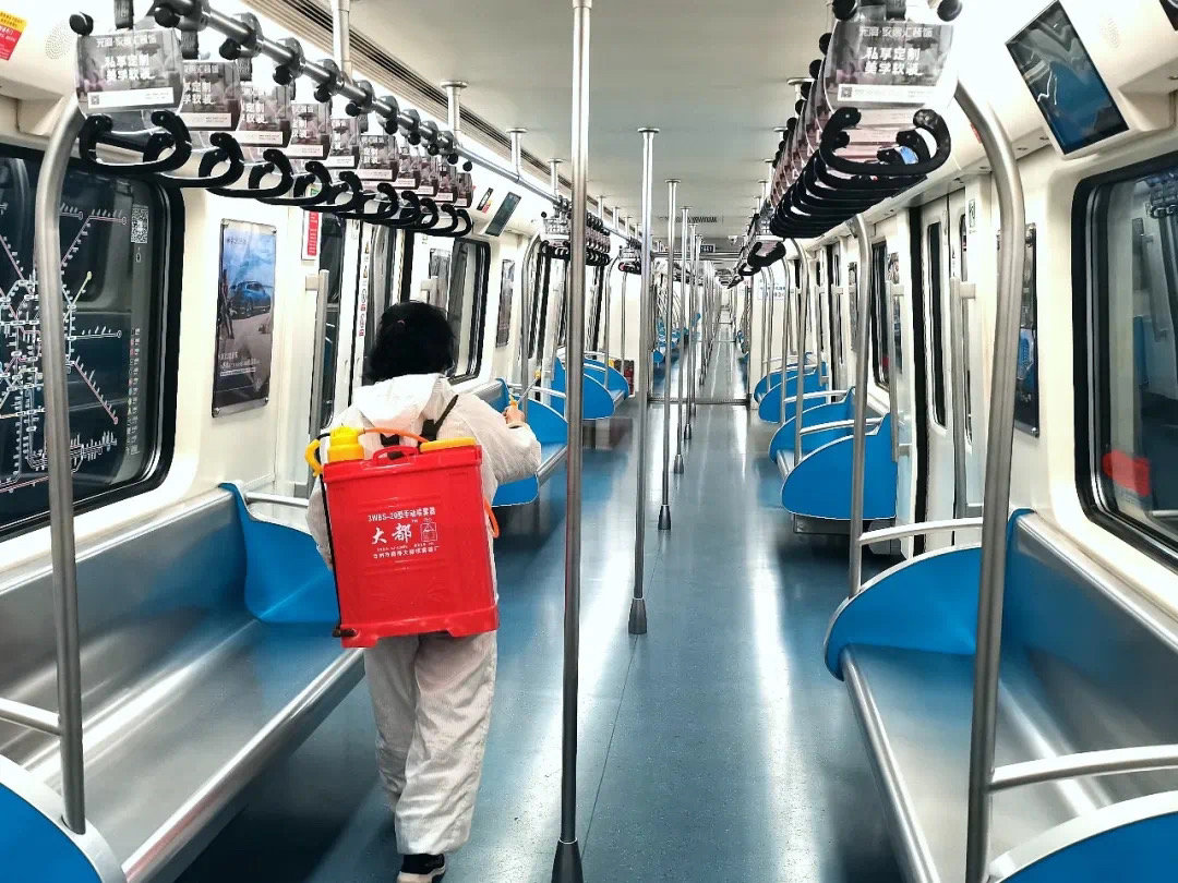 列车上,成都地铁每6个小时对车厢内部乘客易接触部位进行一次消毒工作,如座椅、拉环、立柱、扶手、车门等;每日列车收车回库后,会进行一次全面消毒;定期对列车空调滤网进行消毒。