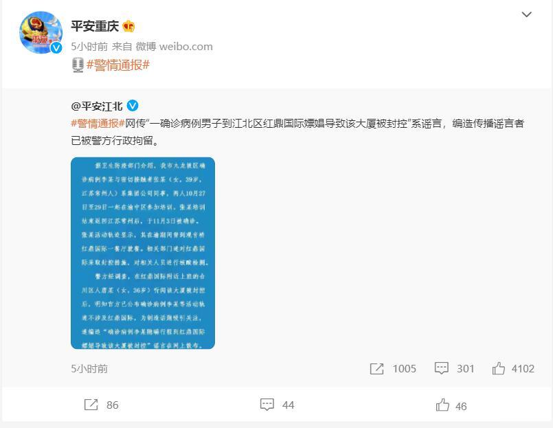 11月5日,重庆市公安局江北区分局通报,网传“一确诊病例男子到江北区红鼎国际嫖娼导致该大厦被封控”系谣言,编造传播谣言者已被行拘。