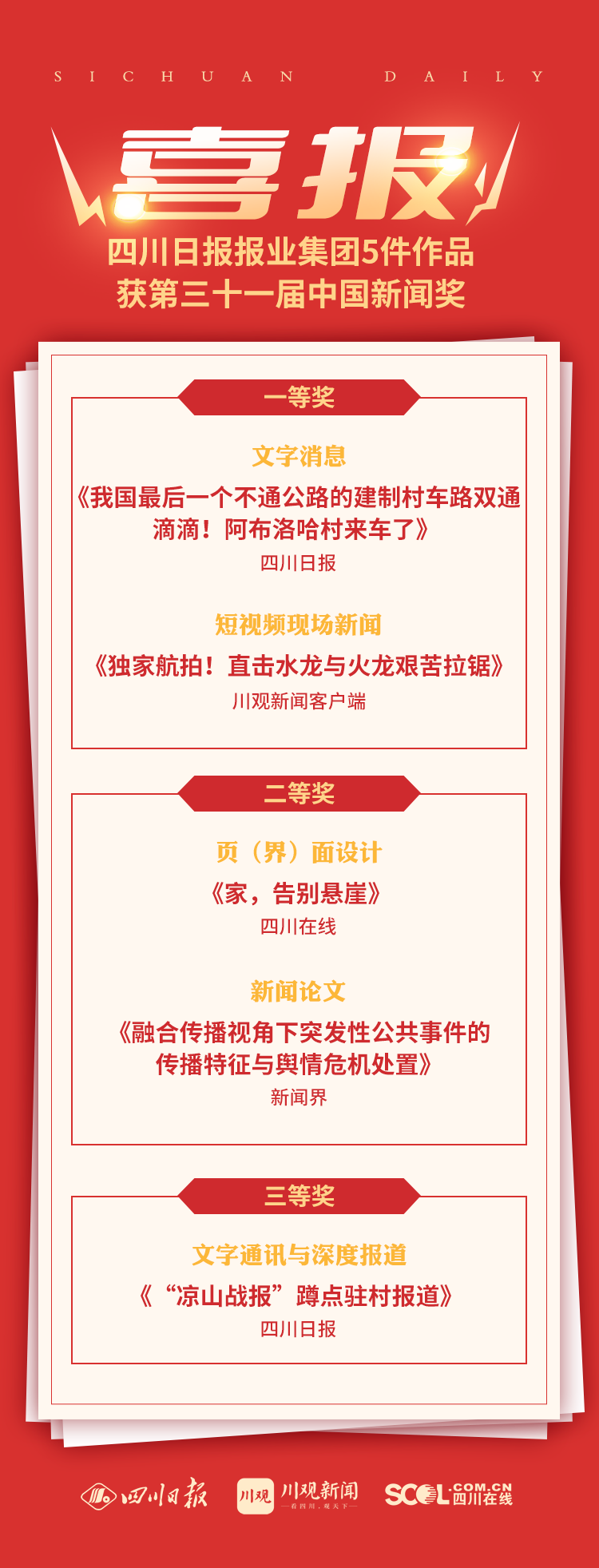 其中,四川日报报业集团5件作品榜上有名,包括2件一等奖、2件二等奖和1件三等奖。一等奖作品分别是四川日报社文字消息《我国最后一个不通公路的建制村车路双通 滴滴!阿布洛哈村来车了》和川观新闻短视频现场新闻《独家航拍!直击水龙与火龙艰苦拉锯》。二等奖作品分别为四川在线页<界>面设计《家,告别悬崖》、新闻界新闻论文《融合传播视角下突发性公共事件的传播特征与舆情危机处置》。三等奖作品是四川日报社文字通讯与深度报道《“凉山战报”蹲点驻村报道》。